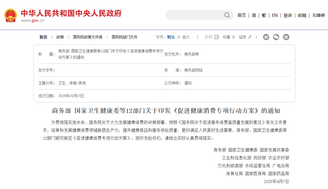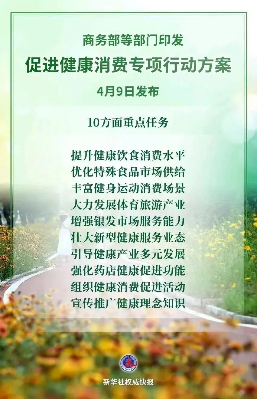 4月9日,商务部、国家卫生健康委等12部门联合印发《促进健康消费专项行动方案》。其中,《方案》明确: