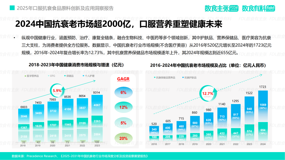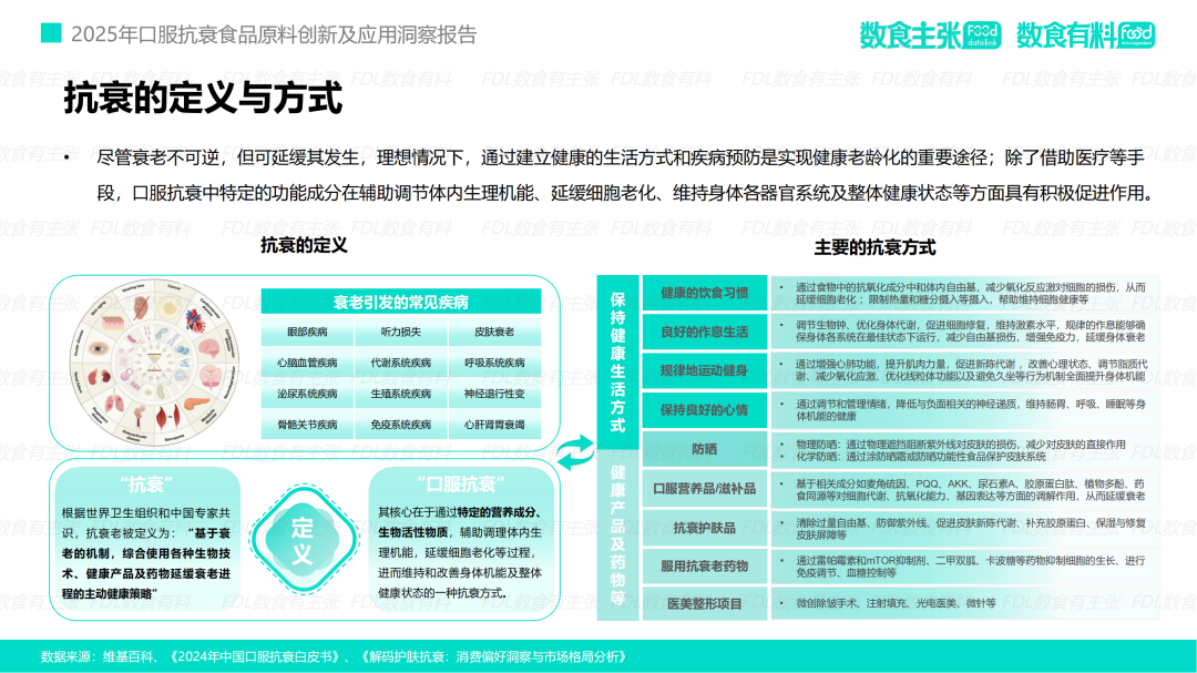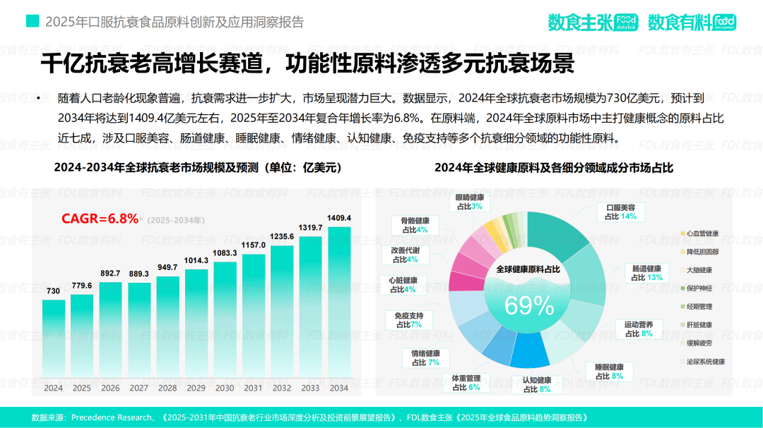 正是在市场需求与科技进步的交汇点上,FDL数食主张与FDL数食有料联合发布的《2025 科学口服·鲜活未来——口服抗衰食品原料创新及应用洞察报告》提供了一份至关重要的路线图。该报告不仅全面扫描了市场的宏观动态,更精准剖析了驱动消费者决策的深层心理,并前瞻性地揭示了前沿原料将如何重塑行业格局。