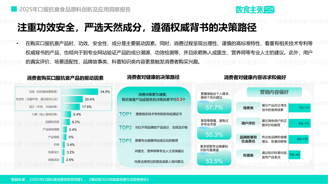 02 功效、安全与权威背书 成消费者决策“铁三角” 随着市场的日益成熟,口服抗衰领域的消费者已经完成了从盲目跟风到理性审视的深刻转变。他们不再是营销信息的被动接收者,而是手持放大镜、主动求证的“研究者”。 报告显示,在消费者心中,一个值得信赖的产品必须稳固地立足于一个由功效、安全与成分构成的“决策铁三角”之上。 功效为王,是这一三角的绝对顶点,34.8%的消费者将“抗衰效果明显”视为首要驱动力。在所有考量因素中,可见且可感知的真实效果,始终是驱动消费的首要且最核心的动力。 紧随其后的,是对安全性的零容忍和对成分纯净天然的执着偏好,它们共同构成了信任基石的两翼。这三者环环相扣,任何一环的薄弱都难以赢得当下消费者的最终青睐。 在消费决策路径中,用户展现出严谨的高标准特性。他们不再轻易相信广告宣传,而是倾向于通过多渠道验证信息,其决策行为高度一致地指向了对“客观证据”的探寻。 首先,他们会优先搜寻产品背后的技术专利和权威机构的检测证书,将其视为评判产品专业度的首要门槛;其次,他们会理性地横向对比不同品牌间的配方、功效及价格,以寻求最优选择;最后,他们还会求助于专业健康网站、KOL乃至身边“懂行”人士的推荐,进行信息的交叉验证。 这一系列严谨的行为模式清晰地表明:在当今的口服抗衰市场,模糊的承诺已然失效。唯有那些具备权威科学背书、作用机理明确且能提供个性化解决方案的产品,才能最终穿透重重疑虑,赢得消费者的坚定信赖。