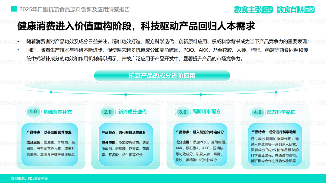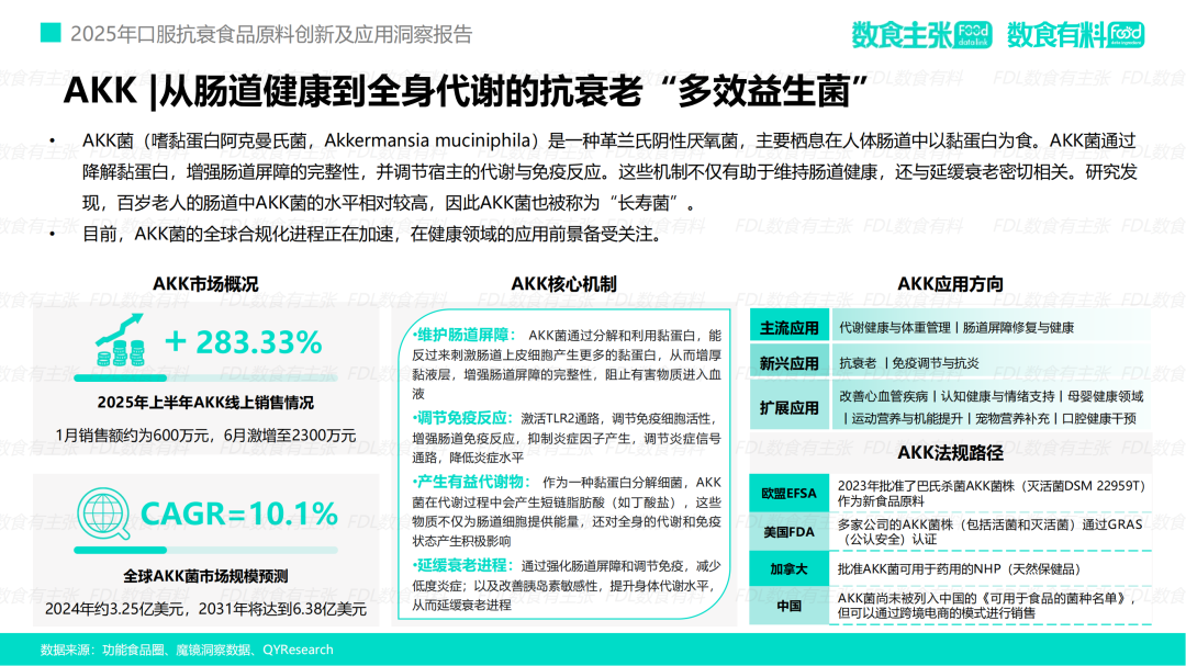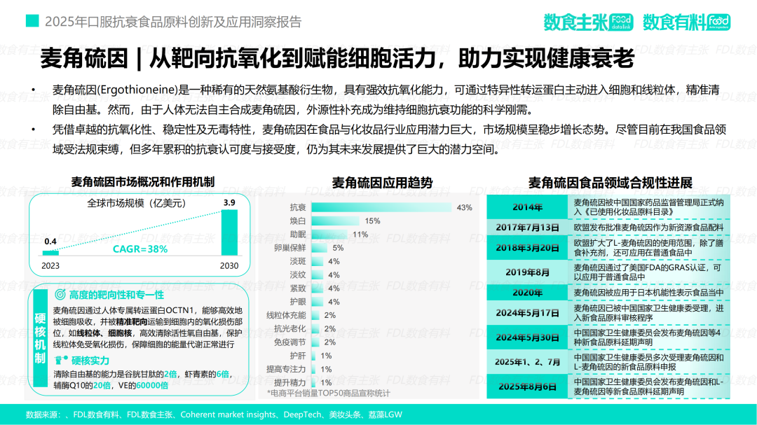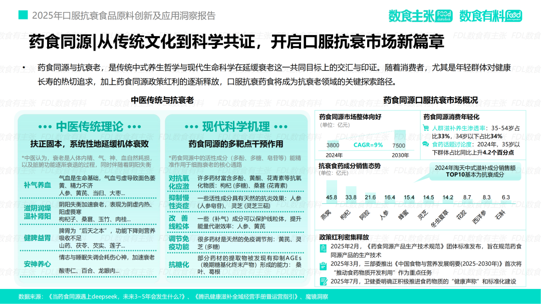 03 成分创新4.0 科技驱动下的精准抗衰革命 为满足消费者对“科学循证”的极致追求,口服抗衰领域正经历一场深刻的成分革命,行业正从“概念驱动”全面迈向4.0“科技驱动”时代。 从最初以维生素、矿物质等维持生命基本需求的元素为核心的基础营养时代,到2.0活性成分时代,市场上涌现出胶原蛋白、虾青素等明星成分,初步满足了消费者对特定功效的期待。再到3.0精准配方时代,行业进一步深入科学层面,引入了如PQQ、麦角硫因、AKK菌等作用机制更清晰、靶点更明确的前沿成分。 如今,进入科学循证时代,产品的价值不仅在于拥有前沿成分,更在于通过科学的复配实现协同增效,并通过严谨的人体试验验证其最终功效,真正完成了从实验室理论到消费者体验的价值闭环。 进一步细化颗粒度,专注于创新成分,FDL数食主张发现越来越多契合当前市场需求的新原料不断涌现,为行业拓展了更为广阔的想象空间。 麦角硫因:从靶向抗氧化到赋能细胞活力 麦角硫因(Ergothioneine)作为一种高效的天然抗氧化剂,能够通过特异性转运蛋白精准地进入细胞和线粒体,有效清除自由基。凭借其卓越的抗氧化性、稳定性和安全性,麦角硫因正迅速成为市场的新宠。 目前,其全球市场规模预计将从2023年的0.4亿美元增长至2030年的3.9亿美元,复合年增长率高达38%。尽管在中国作为食品原料的法规仍在推进过程中,但其市场接受度和认可度已为其未来的发展奠定了坚实的基础。 案例: 超级元料的提拉黑金绷带胶囊主要成分纯麦角硫因,每粒含量达50mg,该成分被誉为「地表至强抗氧化剂」。源自中国第一高原热泉【曲卓木热泉天然专利菌种】,纯度99.99%、比旋度+135。产品直达线粒体深度充能,有效改善皮肤状态,减少皱纹、抗UV老化,提升精力改善睡眠,延缓衰老 图源:品牌京东宣传页 AKK菌:从肠道健康到全身代谢抗衰的“长寿菌” AKK菌(嗜黏蛋白阿克曼氏菌)作为一种重要的肠道益生菌,通过维护肠道屏障、调节免疫反应及产生有益代谢物,能够有效延缓衰老进程。研究表明,百岁老人肠道内的AKK菌含量显著较高,因此被誉为“长寿菌”。 市场数据显示,2025年上半年,AKK菌的线上销售额激增283.33%,全球市场规模预计将从2024年的3.25亿美元攀升至2031年的6.38亿美元,彰显出其巨大的市场潜力。 案例: 慕恩生物推出的Master Moon® 御龄抗衰益生菌,依托全球最大、菌株数量超32万株的益生菌菌株库,筛选出卓越的嗜黏蛋白阿克曼氏菌AKM Lab – 01®,申请10项专利护航。这款御龄抗衰益生菌产品复配麦角硫因、PQQ等热门抗衰原料,从多个靶点激发机体青春活力。 图源:慕恩生物 药食同源:从传统文化到科学共证的现代新生 如今,药食同源理念正处于传统中式养生哲学与现代生命科学的交汇点。伴随着科技的不断进步,人参、枸杞、燕窝等传统滋补成分的抗氧化、抗炎、抗糖化等作用机理被逐步揭示和验证。年轻消费群体对健康长寿的热切追求,加之政策红利的持续释放,正共同推动药食同源口服抗衰市场迈入崭新篇章。 与此同时,随着市场规范的日益完善和新需求的不断涌现,科学循证研究的持续深入,药食同源市场预计将迎来更为广阔的发展空间。相关数据显示,其市场规模预计将从2024年的3800亿元增长至2030年的7500亿元,年均复合增长率(CAGR)达到9%。一个近万亿级的市场正虚位以待,吸引更多企业掘金其中。 案例: 金骏康的槐花不老莓固体饮料,基于深入的人体仿生学研究,探索药食同源成分槐花的核心通路机制,成功将中医功效与现代抗衰靶点相结合。 该产品拥有多项国家发明专利,采用天然植萃成分,温和守护,无副作用;专研酶解技术,确保功效成分更易吸收;0糖配方,配料简单纯净,使用更安心。产品能有效促进胶原蛋白生成,柔润肌肤、紧致抗皱;提升血清素含量,缓解焦虑情绪,改善深度睡眠;实现细胞级抗衰,增强线粒体活力。 此外,第三方人体试吃测试报告证实,连续使用14天即可显著改善肌肤问题。 图源:金骏康 口服抗衰市场正从宽泛的概念逐步演变为一个以科学驱动、需求细分的精准健康管理领域。消费者对产品功效、安全性和科学证据的日益追求,正迫使整个产业链向更高标准转型升级。未来,能够将前沿科研成果、高质量创新原料与精准消费者洞察相融合的品牌,将在这一充满机遇的蓝海市场中脱颖而出,真正开启并引领“科学口服·鲜活未来”的新时代。 本文及报告来源:FDL数食主张、FDL数食有料