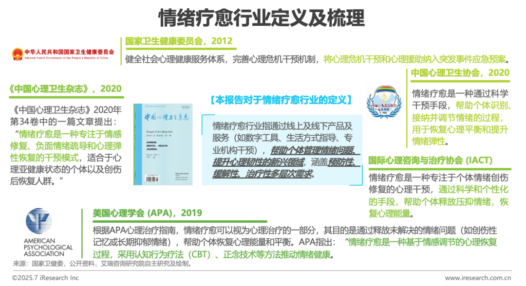 近年来,随着社会节奏的加快和心理压力的上升,情绪健康问题已成为国内外广泛关注的重要议题。从国家政策到社会研究,各方对情绪疗愈的重视程度持续提升。 国家卫生健康委员会在“十四五”心理健康规划中明确指出,需健全社会心理健康服务体系,特别注重针对情绪问题的早期干预。 与此同时,国际组织如美国心理学会(APA)等机构也在相关行动计划和研究中,将情绪疗愈作为心理健康促进的重要组成部分。在此背景下,艾瑞咨询通过本次研究,系统梳理了情绪疗愈行业的核心定义与边界。报告将情绪疗愈划分为线上和线下两大介入方式,并从数字工具、自我疗愈、线下机构等角度全面探讨其服务及产品形态,为行业未来发展提供精准参考。