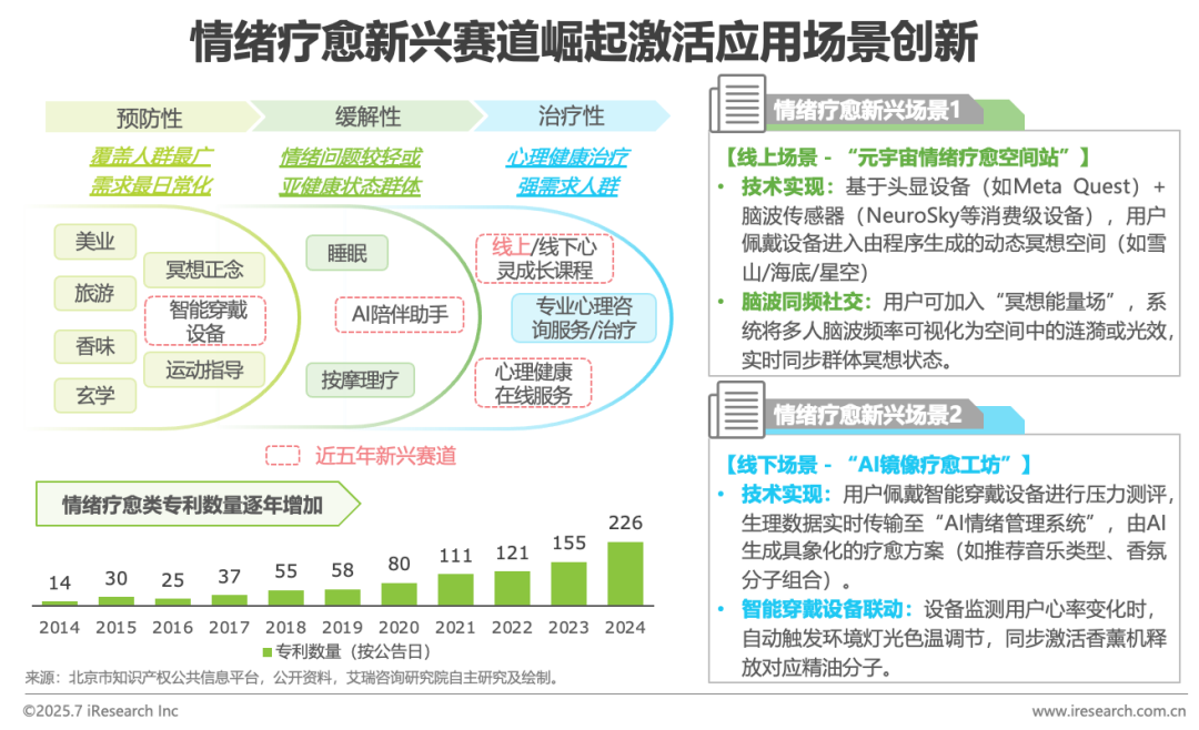 当前情绪疗愈行业呈现多元化与创新加速并行的发展态势。供给端方面技术驱动显著,近五年国内情绪疗愈类专利申请量年均增长超25%。情绪疗愈行业已形成预防性-缓解性-治疗性三级体系,覆盖虚拟现实、生物传感、生成式AI等前沿领域,新兴赛道与成熟业态协同发展,既满足Z世代对科技感与仪式感的双重需求,也为传统心理健康服务注入创新动能。