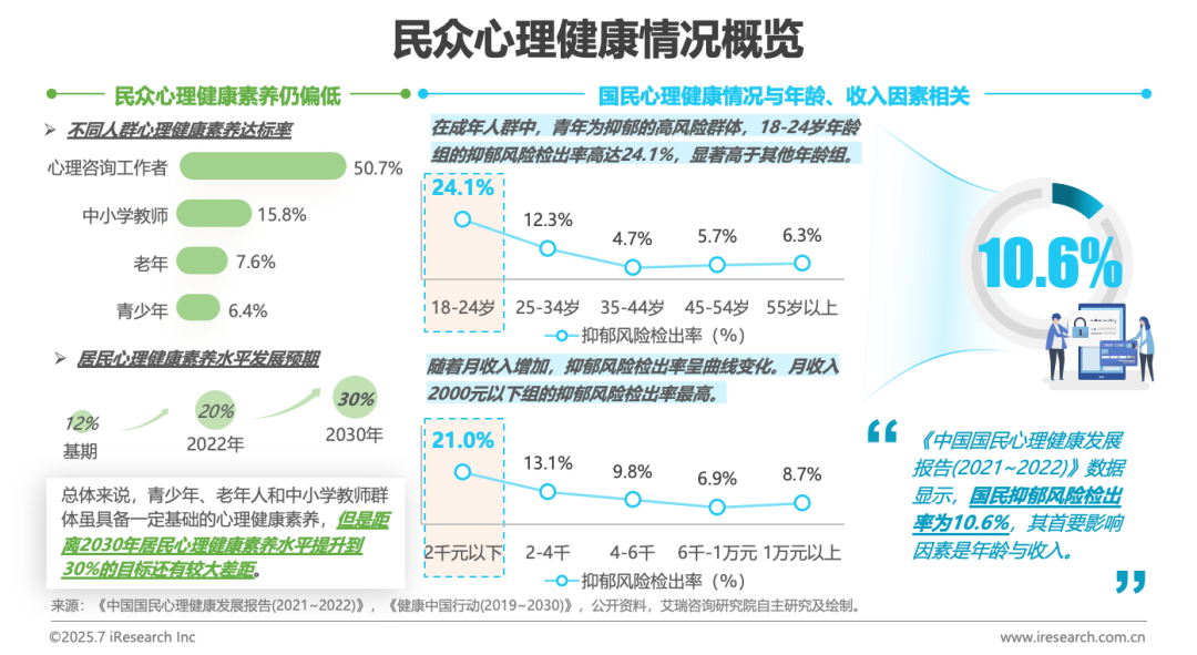 随着社会节奏的加快和生活压力的增加,心理健康问题逐渐成为公众关注的焦点。根据《中国国民心理健康发展报告(2021~2022)》数据显示,我国民众的心理健康素养水平仍偏低,青少年的达标率仅为6.4%。这表明,尽管部分群体具备一定的心理健康素养,但整体水平仍有待提高。 除此之外,在成年人群中,18-24岁年龄组的抑郁风险检出率高达24.1%,月收入2000元以下组的抑郁风险检出率最高,国民心理健康情况与年龄、收入等因素密切相关。由此可见,提升心理健康素养水平迫在眉睫,疗愈经济的市场需求庞大。