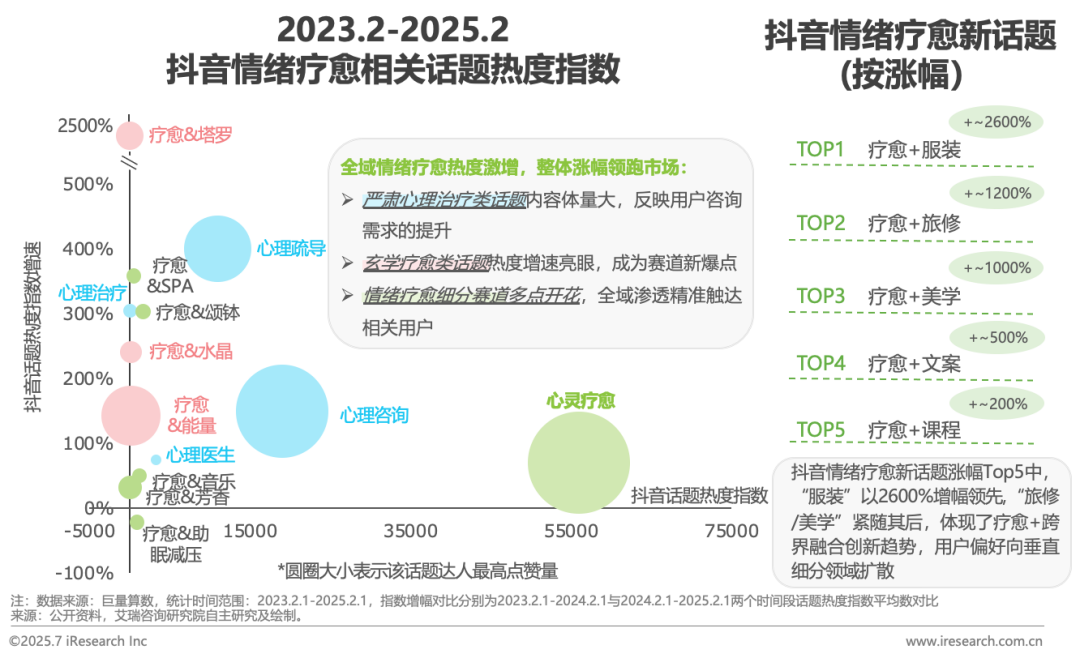 2023-2025年抖音情绪疗愈话题热度指数变化,反映了用户偏好从泛化疗愈转向精准场景需求,“疗愈+”跨界模式成核心驱动力。服装、旅行等生活化领域与疗愈结合后互动量提升显著。严肃心理治疗类内容保持高基数体量,体现用户对专业心理服务的持续需求;玄学+疗愈类话题增速亮眼,展现年轻群体对神秘学疗愈的探索热情。内容创作者通过跨领域融合与精细化运营,在情绪疗愈赛道实现用户心智的高效渗透。