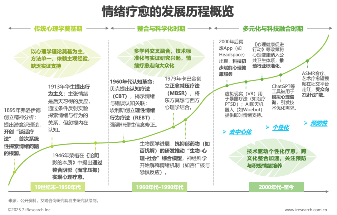 理论奠基—科学变现—技术普惠的发展脉络,始终围绕“情绪价值”的挖掘与修复,反映现代社会从“治疗疾病”到“追求幸福”的深层转型