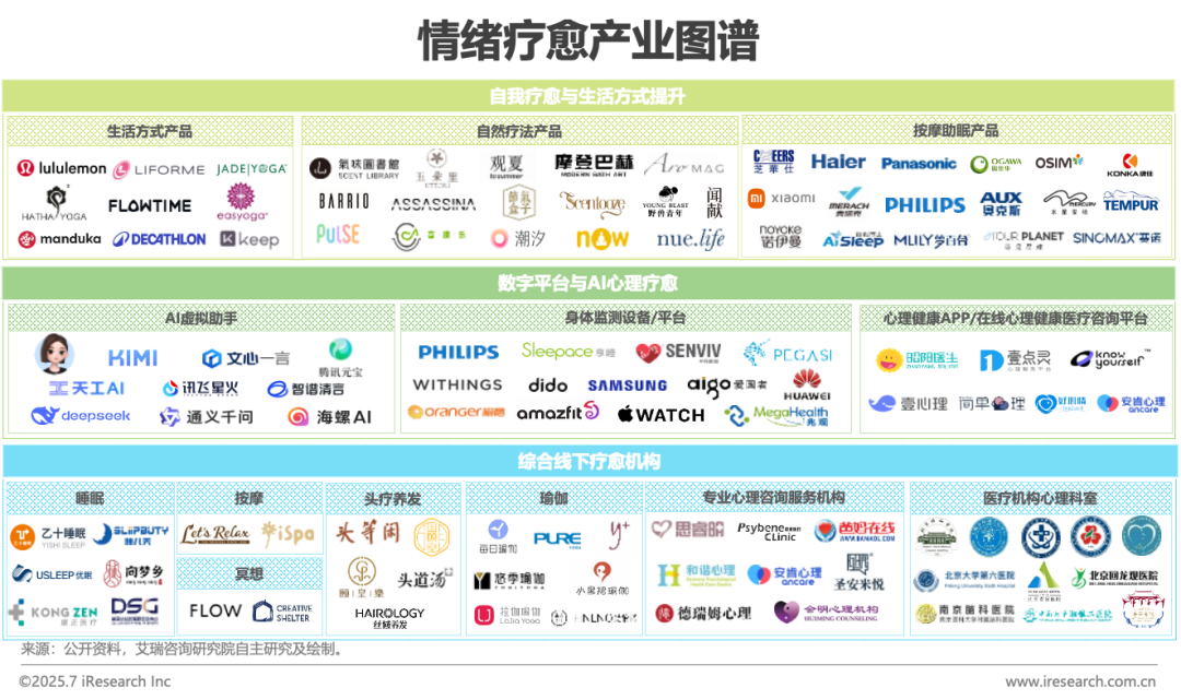 情绪疗愈产业通过深度融合自我疗愈与外部干预疗愈、线上数字化平台与线下实体服务,为用户打造了从线上到线下、从工具到服务的全场景解决方案。产业汇聚了众多核心企业,形成了三大核心板块:自我疗愈与生活方式提升领域,聚焦生活方式产品、自然疗法及按摩助眠产品;数字平台与AI疗愈领域,提供AI虚拟助手、智能检测设备及在线心理健康平台;线下疗愈机构领域,整合睡眠、头疗、心理咨询服务等机构及医疗机构心理科室。三大板块协同赋能,推动产业向专业化、智能化、场景化发展。