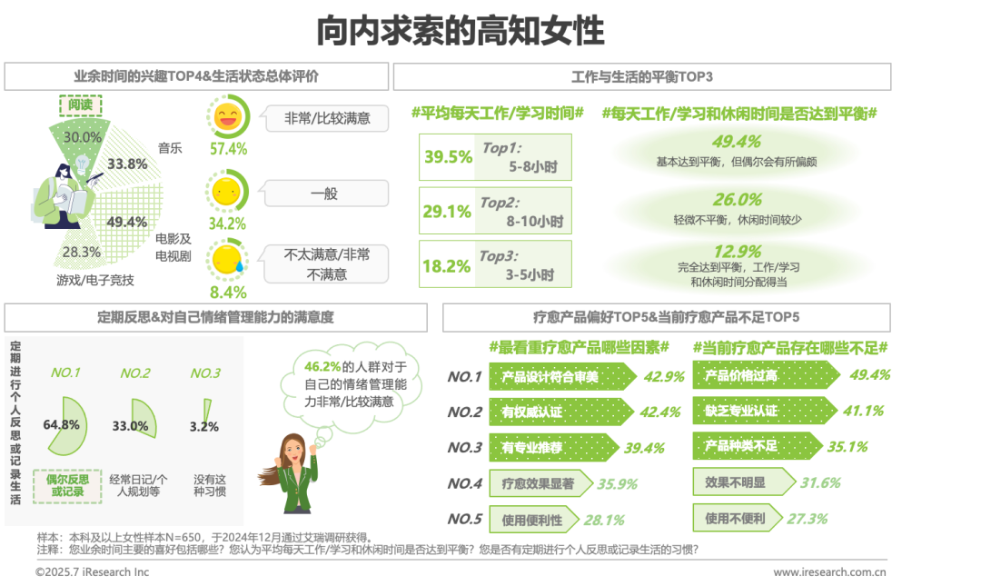 03 中国情绪疗愈行业人群洞察 精细人群画像:向内求索的高知女性 该人群的生活满意度较高,注重阅读与反思,追求工作生活平衡,偏好符合审美的疗愈产品的同时,对产品价格较敏感