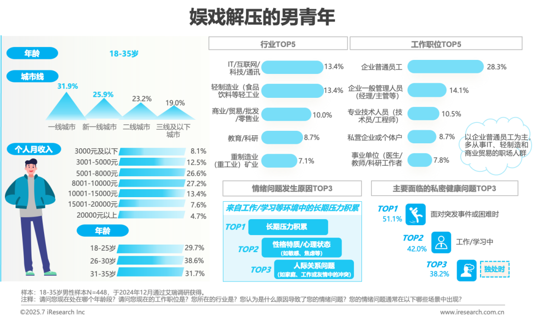 精细人群画像:娱戏解压的男青年 多为一二线城市的18-35岁男青年,行业较多分布于IT及制造业,收入中等偏上,工作压力大,部分人群独自承受情绪问题