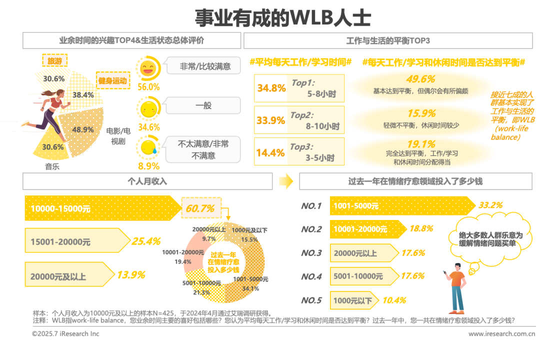 精细人群画像:事业有成的WLB人士 该人群月入1-2万为主,有效平衡了工作和生活(WLB),兴趣偏向健身与旅游,超半数人群对生活总体满意,且大多乐意为情绪疗愈买单