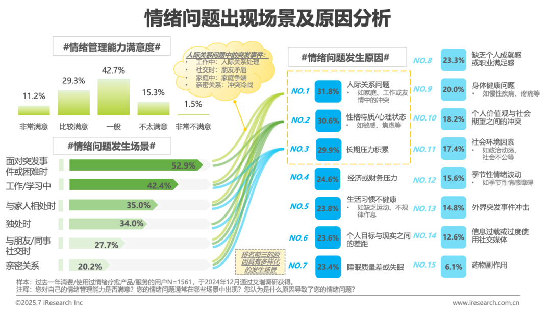 原因及场景 情绪管理满意度较低,人际、性格、长期压力三重困局贯穿多场景