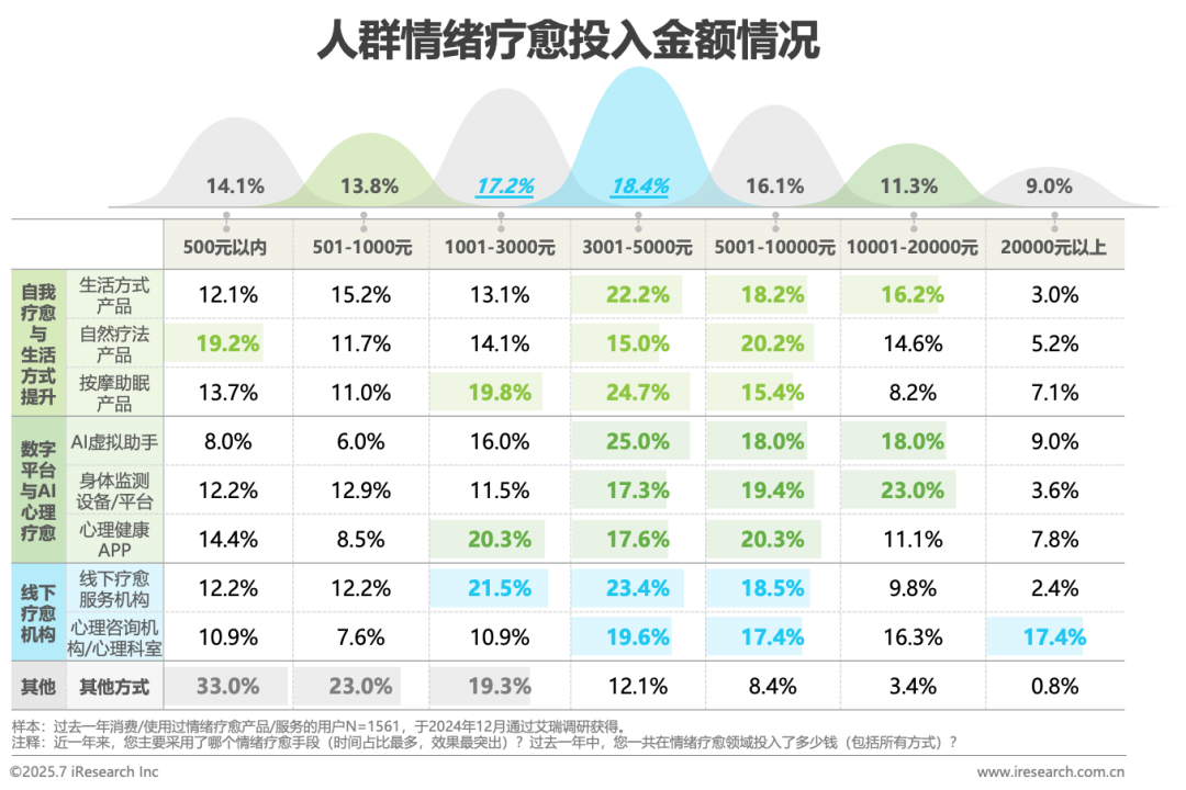 投入金额 人群的情绪疗愈投入金额普遍集中在1001-5000元之间,消费差距较小