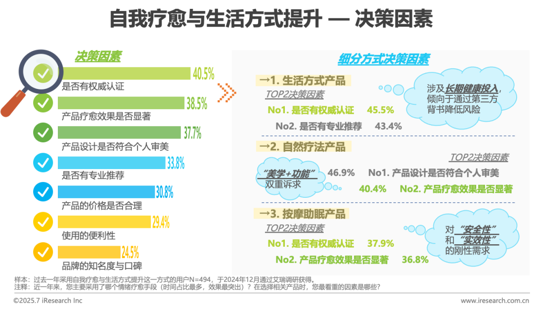 决策因素-自我疗愈与生活方式提升 整体用户关注权威认证与效果显著性,细分场景呈现需求与决策差异
