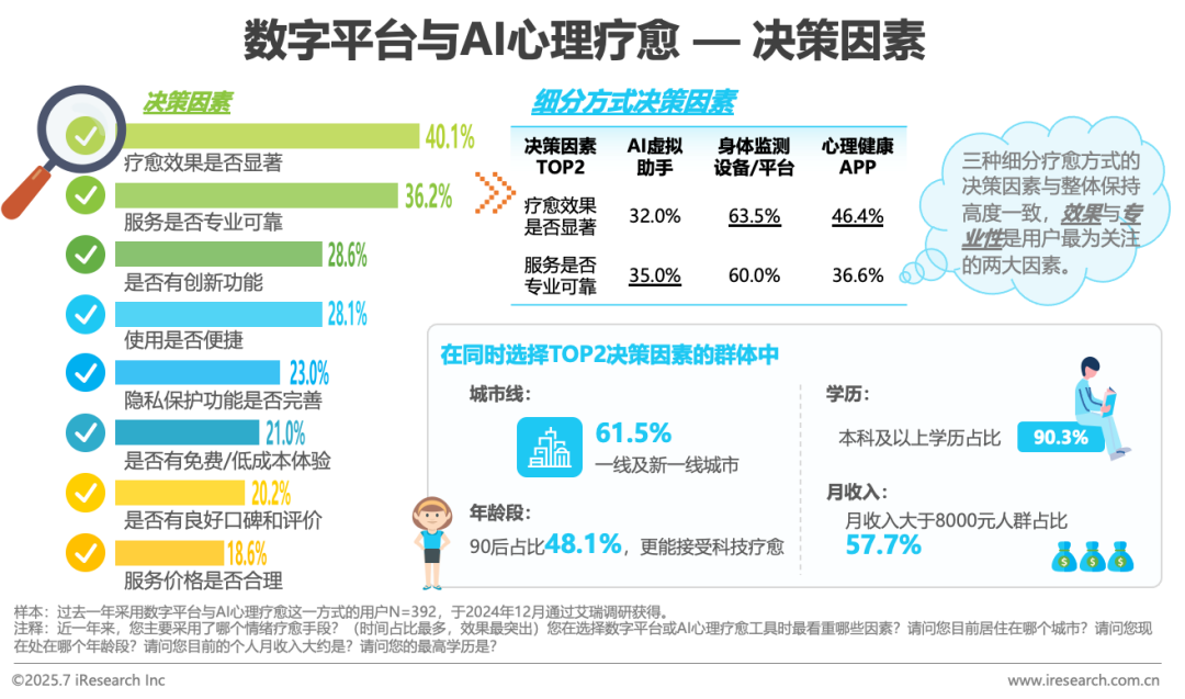 决策因素-数字平台与AI心理疗愈 疗愈效果和服务专业性是关键因素,决策群体主要为高净值年轻人群