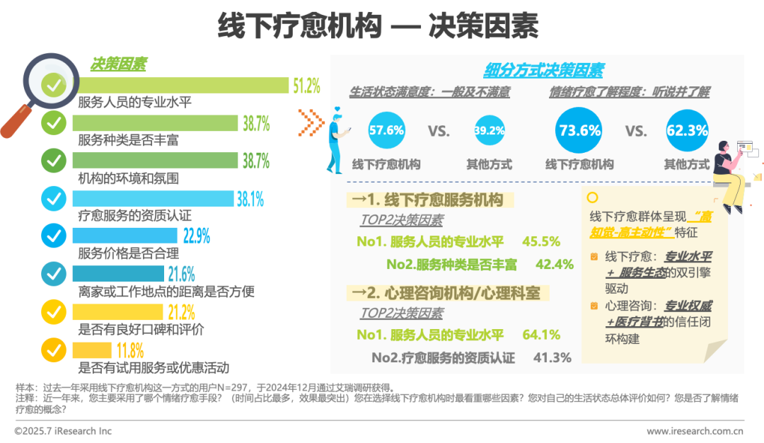 决策因素-线下疗愈机构 专业性是第一要义,线下疗愈服务机构凭服务生态破局,心理咨询则更强调资质认证与医疗背书