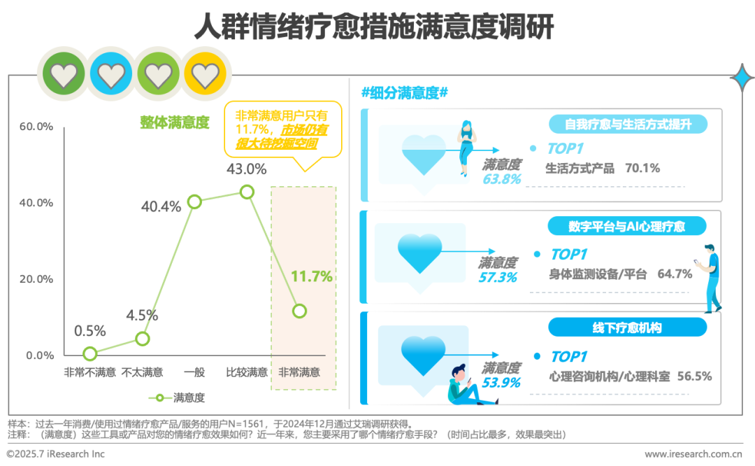 满意度分析 54.7%人群对情绪疗愈措施持满意态度,生活方式产品满意度最高