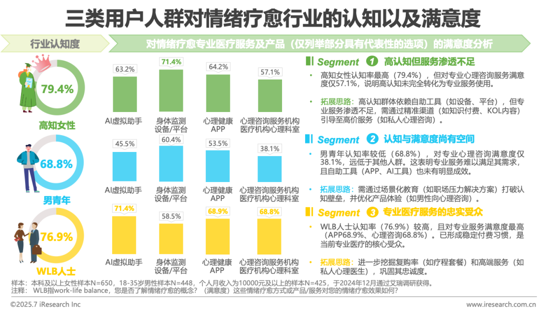调研数据表明,情绪疗愈行业已呈现明显的用户分层:中高收入的WLB人士群体凭借高认知率和专业服务高满意度,已成为行业稳定基本盘,尤其偏好心理咨询等高价服务。男青年人群的较低认知和满意度有待市场教育打破认知壁垒。而高知女性群体虽以79.4%的认知率居首,但专业服务渗透率不足,其需求更多流向心理健康APP等自助工具,形成显著“认知-行为”落差。这一矛盾恰恰揭示了增长机会——通过知识付费、AI辅助等轻量入口引导高学历女性向专业服务转化,有望为行业专业医疗产品及服务开辟增量市场。