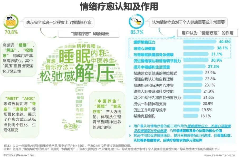 了解程度及重要性 七成用户关注情绪疗愈,关注点主要集中于睡眠、解压与松弛感,需求聚焦缓解压力、改善心理及睡眠健康,其方法趋个性化和生活化