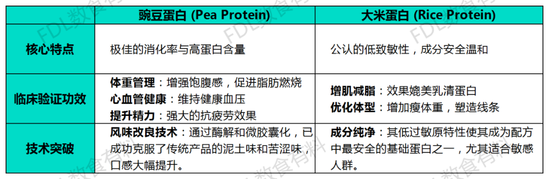 FDL数食有料认为,这两大原料的成熟发展清晰地指明了未来的创新路径。 首先,感官体验已成为新的竞争壁垒。当功效不再是唯一考量时,更优越的口感、质地和溶解性将是赢得消费者的关键。其次,功能复合化是价值提升的核心。植物蛋白自身的健康益处,使其成为搭载益生菌、适应原等其他功能性成分的理想基底。 因此,对于品牌而言,一方面,可通过“豌豆+大米”的复配方式,实现氨基酸谱与口感的双重优化;另一方面,则应跳出单一增肌场景,针对体重管理者、都市白领等细分人群,开发与特定健康诉求强相关的复合功能产品。