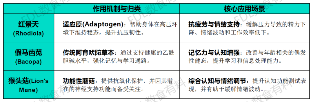 02 促智脑健康 打响“认知力”保卫战 如果说植物蛋白满足的是身体的基础构建需求,那么益智补充剂(Nootropics)则直击现代社会最核心的痛点:认知力的损耗。 在信息过载、工作压力和持续“在线”的时代,消费者对增强记忆力、专注力和整体认知表现的渴望,正推动益智补充剂成为健康消费领域最具潜力的赛道之一。 2024年,全球益智补充剂市场规模已达23亿美元,并预计在未来十年内翻一番以上,到2034年增长至50亿美元,展现出高达7.8%的复合年增长率。 这一赛道的迷人之处在于其背后坚实的科学支撑。它并非依赖单一的刺激性成分,而是涵盖了一系列作用机制各异的营养保健化合物。其中,红景天、假马齿苋和猴头菇(狮鬃菇)是当前研究最深入、应用最广泛的三大明星成分,它们分别代表了应对不同认知挑战的解决方案。