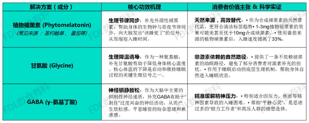 同时,未来的睡眠支持市场,将不再是单一成分的天下。协同复方和场景细分将成为品牌建立差异化优势的两大核心战略。 如开发差旅时差调整胶囊(主打植物褪黑素)、考前减压安睡饮(主打GABA与草本)或运动后修复睡眠粉(主打甘氨酸与镁)。通过精准切入消费者的具体生活场景,品牌才能真正实现从“卖产品”到“提供解决方案”的价值跃升。