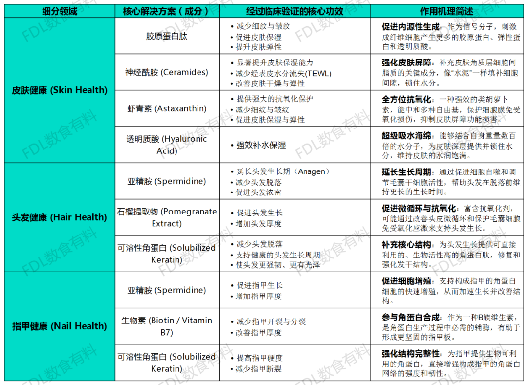 首先,全身心美容的理念将成为主流。 品牌应跳出“头痛医头”的局限,将皮肤、头发、指甲的健康与情绪、睡眠、肠道健康等因素关联起来。例如,开发一款产品,将改善皮肤的胶原蛋白与缓解压力的藏红花、支持肠道健康的益生菌进行复配,讲述一个“压力痘”、“情绪差导致皮肤暗沉”的完整解决方案故事。 总而言之,通过从单一成分的单点突破,转向多成分协同的系统性方案,并聚焦特定人群的细分场景,品牌才能在这片美丽经济的蓝海中,构筑起难以被模仿的专业壁垒。