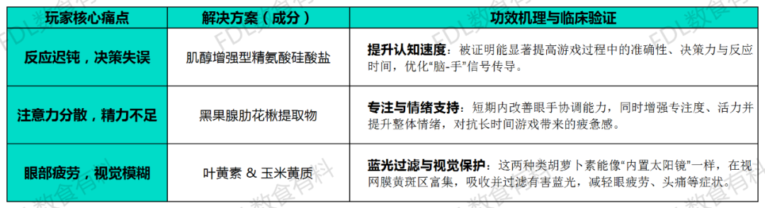 10 游戏营养 为电竞运动员的精准赋能 当电子竞技被国际奥委会承认为一项潜在的体育活动时,游戏补充剂,这一全新的、高度精准的细分市场便应运而生。目前全球超过30亿的游戏玩家,构成了这个市场的庞大基石。他们不再仅仅是娱乐者,更是需要长时间保持高度专注、快速反应和视觉敏锐度的电竞运动员。这一群体的独特需求,为膳食补充剂行业开辟了一片全新的蓝海。 与传统的益智或运动营养产品不同,游戏补充剂的配方设计极具针对性,其核心目标是全面优化游戏体验,覆盖从大脑到眼睛再到双手的完整链路。 FDL数食有料认为,这一赛道的成功关键在于深入理解玩家在长时间游戏过程中的核心痛点,并提供有科学依据的、能带来可感知效果的解决方案。