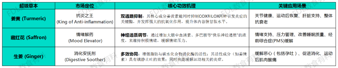11 现代草本 传统智慧与科学实证的融合 在天然健康浪潮的推动下,拥有数千年应用历史的草药补充剂,正迎来一个由现代科学验证驱动的黄金复兴时代。消费者对天然、植物源解决方案的信任与日俱增,这使得草药补充剂市场保持着强劲的增长势能。2024年,其全球市场价值已达524.3亿美元,并预计以9%的复合年增长率在2032年达到879.8亿美元的宏大规模。 FDL数食有料认为,这一赛道的持续繁荣,核心在于“经典永流传”。那些经受住时间考验,并不断被现代临床研究所证实的“超级草本”,构成了市场的坚实基石。其中,姜黄、藏红花和生姜,是当前最受瞩目且应用最广泛的三巨头。