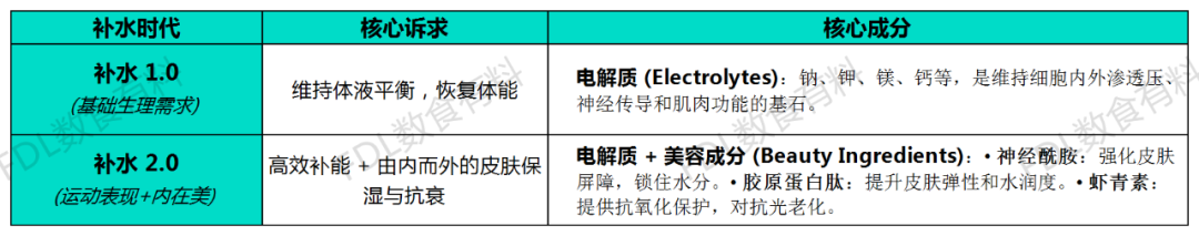 12 补水补充剂 从解渴到全能的功能进化 当前,补水补充剂赛道正在经历一场现象级的爆发式增长。2024年,全球补水与电解质市场规模已高达360亿美元,并预计以7.9%的复合年增长率在2034年增至827亿美元。在美国市场,其热度更是惊人,SPINS数据显示其同比增长率达到了49.3%。其背后是产品这已不再是专业运动员的专属,而是渗透到日常工作、健身、甚至美容场景中的全民刚需的真实体现。 FDL数食有料认为,这场增长的根本驱动力,是消费者对“补水”概念的认知升维。它已从满足生理基本需求的“补水1.0”(解渴),进化到兼顾运动表现与美容健康的“全能补水2.0”时代。
