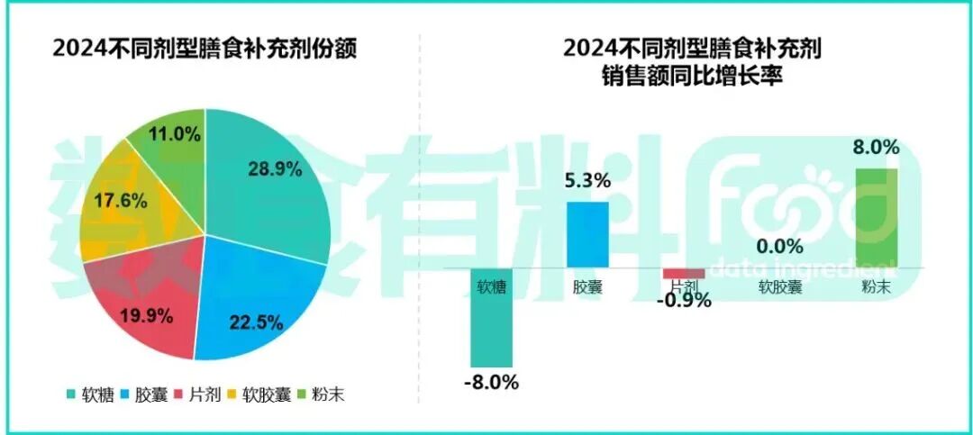 曾经风光无两的软糖,虽然仍以28.9%的份额占据头把交椅,但其销售额却出现了8.0%的同比下滑。负增长的背后,是消费者日益增长的软糖疲劳,徒有其表的“零食化”创新已触及天花板。 与此同时,两种更传统的剂型正在强势复兴。粉剂以8.0%的同比增长率领跑所有剂型,成为名副其实的增长冠军。尽管其目前市场份额仅为11.0%,但高速增长的背后,是其剂量灵活、吸收迅速、可玩性强(易于添加到各种饮品中)等特点,完美契合了当下消费者对个性化和场景融合的需求。 紧随其后的是胶囊,它以5.3%的稳健同比增长,展示了其持久的生命力。作为专业派的代表,胶囊的持续增长,清晰地反映了消费者对纯净配方、精准剂量和专业性的价值回归。 相比之下,片剂则略显疲态,出现了0.9%的微幅下滑,其吞咽困难和强烈的药丸感是其在新消费趋势下面临的主要挑战。 FDL数食有料认为,这场剂型之战的背后,是消费者对更纯净、更专业、更灵活的追求。软糖的下滑,为品牌敲响了警钟。徒有其表的“零食化”创新已无法满足日益精明的消费者。而粉剂和胶囊的复兴,则指明了方向,即回归补充剂的本质,提供高效、纯粹的营养解决方案。 3、信任背书,第三方认证成为标配 在信息爆炸和信任稀缺的时代,品牌自我宣称的高品质已不足以打动消费者。可验证的、来自权威机构的第三方认证,正从一个加分项变为进入市场的必需品。它不再仅仅是一枚标签,而是品牌为产品构建的信任状的基础。这些认证不仅是质量的保证,更是品牌打开特定圈层大门的金钥匙。
