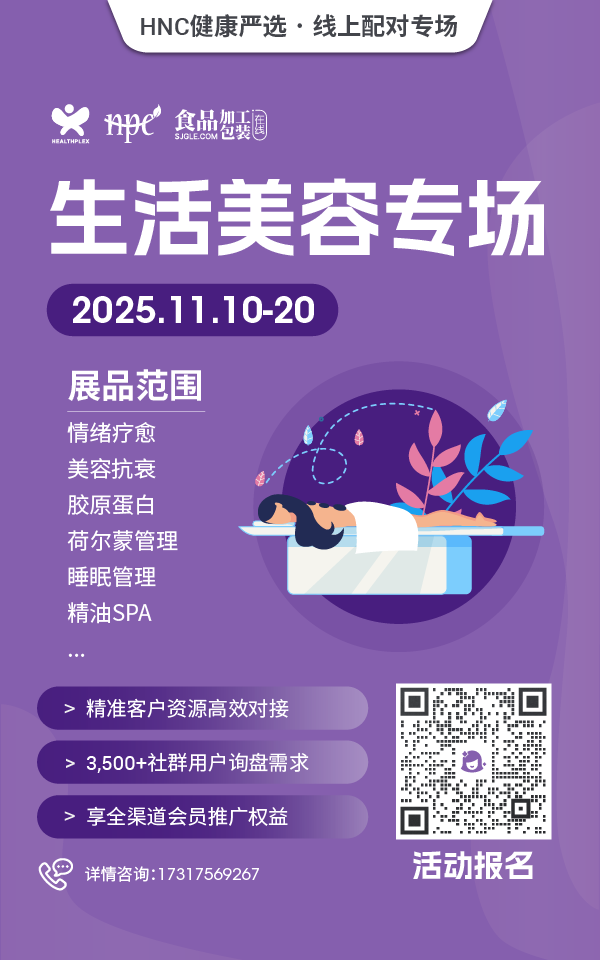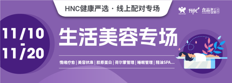 基于当下行业热门趋势,针对细分人群,11月10-20日HNC健康严选 · 线上配对专场活动以“生活美容”为主题,为专业买家提供情绪疗愈、美容抗衰、胶原蛋白、荷尔蒙管理、睡眠管理等产品