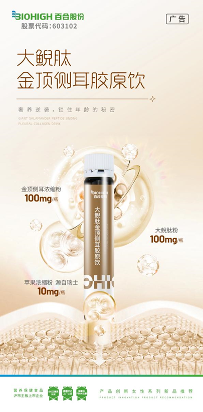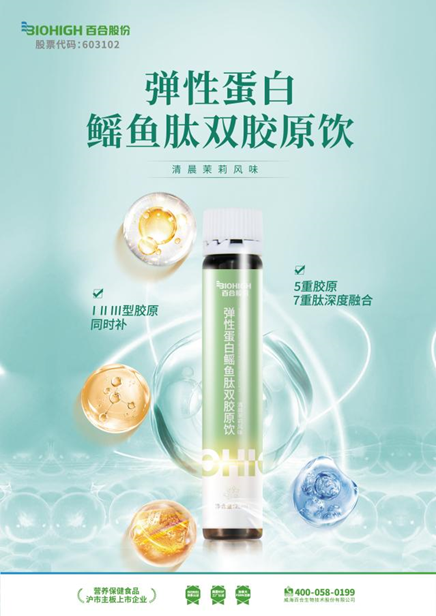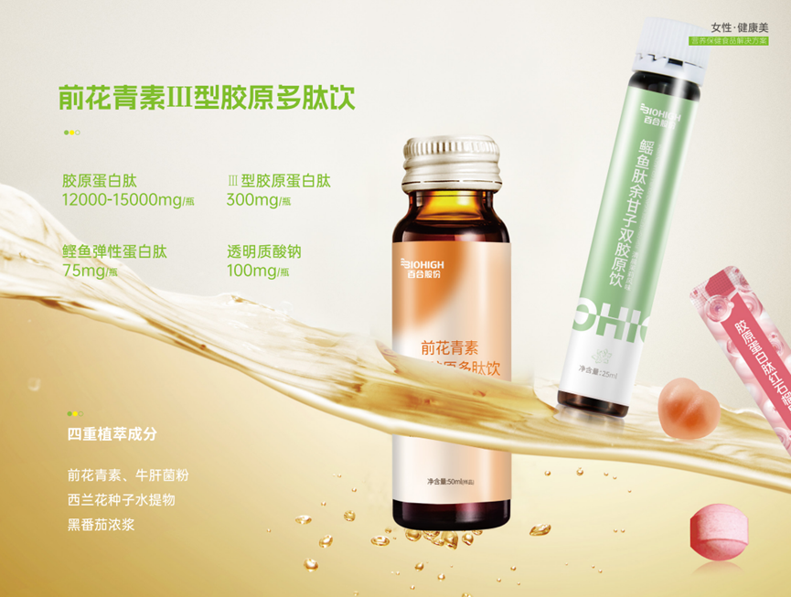 目前市场中,饮品为当下最主流的口服胶原蛋白肽产品形态。百合股份作为营养保健食品行业的头部企业,针对消费者普遍痛点及考虑因素,配方创新,使用前瞻性原料打造一款——“前花青素Ⅲ型胶原多肽饮”。采用了双胶原配方,Ⅰ型和Ⅲ型同时补充,胶原含量达到15000mg/瓶 ,同时添加了海岸松来源的前花青素及牛肝菌粉等多重植萃成分,含有弹性蛋白和透明质酸钠,维生素的添加也采用了经典的ACE组合,帮助达成消费者内调外养的需求。