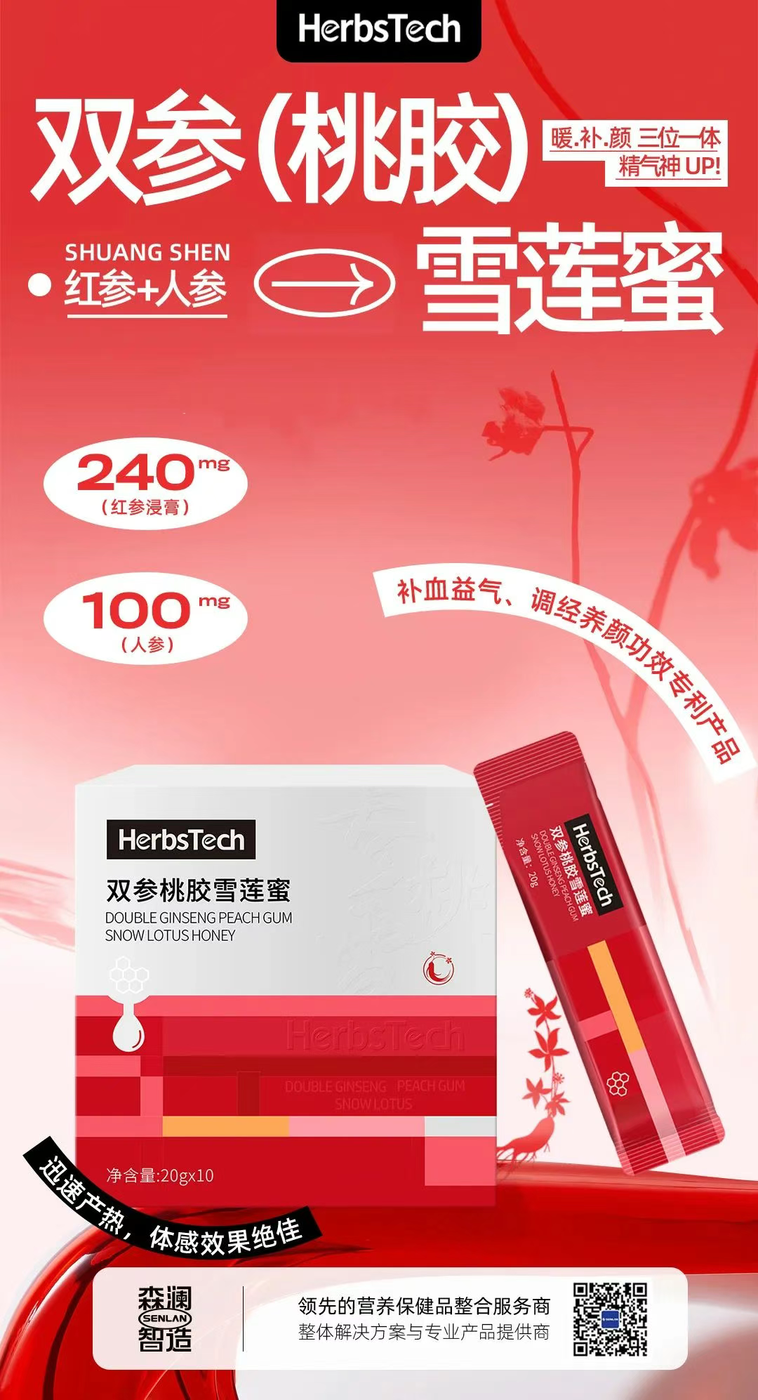 女子以血为本,一生中耗血失血比男性要更多,对于女性而言,气血更为重要。数据显示,气血健康消费者超七成为女性,年龄段集中在30-40岁的中青年阶段,产品效果是消费者选购产品的首要考虑因素。针对消费者普遍痛点及考虑因素,森澜精心打造了一款集“暖、补、颜”三位一体的产品——“双参桃胶雪莲蜜”,旨在满足气血两亏、肝肾阴虚、月经不调等人群的不同需求。双参桃胶雪莲蜜满足了成分党追求“一瓶多补”的需求,在补益气血的基础上,还添加了7种植物精粹,帮助对抗肌肤糖化、氧化问题。