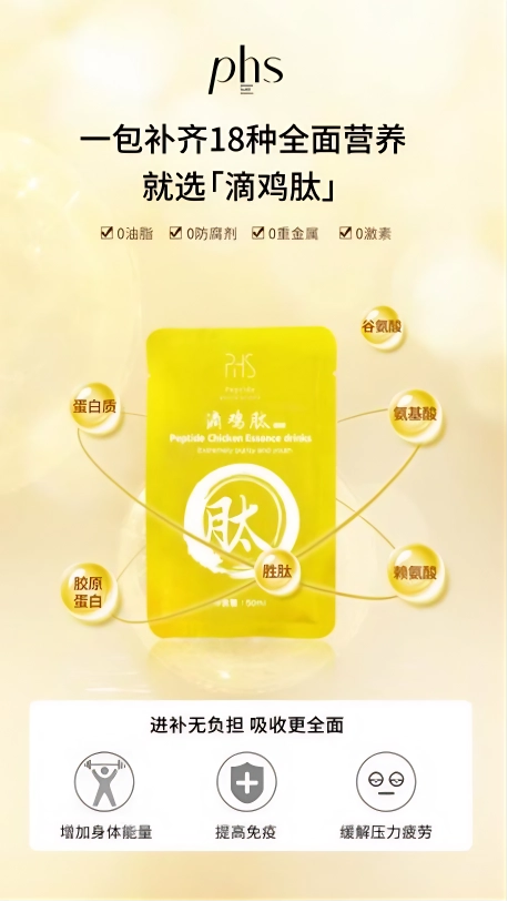 传承百年滴萃工艺,高温高压精萃100天红标土鸡的全鸡营养精华,富含蛋白质、胶原蛋白、胜肽和氨基酸,蛋白质转化为了小分子更易于人体吸收。温和滋补、易于吸收,能够帮助补充人体运作所需能量、促进新陈代谢,对儿童、上班族、银发族、备孕女性十分友好。
