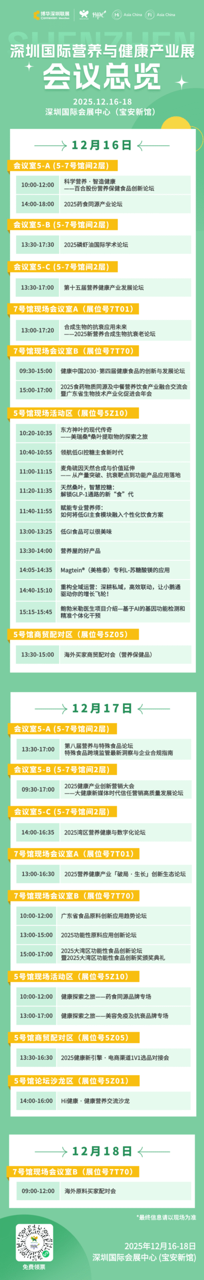 时间 议题/嘉宾 13:00-13:30 2026全球食品原料趋势洞察及创新应用分享 邱昱博士,FDL数食主张、FDL数食有料合伙人兼首席分析师 13:30-13:50 营养保健赛道发展新机会 梁红亮,京东集团京东健康 保健滋补招商负责人 13:50-14:10 战略原料及爆款产品助力客户市场创新 吴恋恋,浙江衡美健康科技股份有限公司 品牌负责人 14:10-14:30 如何通过纳米包裹技术提升食品饮料和药食同源产品的功效 许静,北京德科瑞医药科技有限公司 研发副总 14:30-14:50 从“制药”到“制心”:一个关于美与健康的时代使命 肖莹莹,颜名片 品牌创始人 14:50-15:00 证书颁发仪式 *最终议程请以现场为主 2025营养健康产业「破局 · 生长」创新生态论坛 时间:12月17日 13:00-16:30 地点:7号馆现场会议室A(展位号:7T01,近12号门) 主办方:广东省保健食品行业协会、上海博华国际展览有限公司