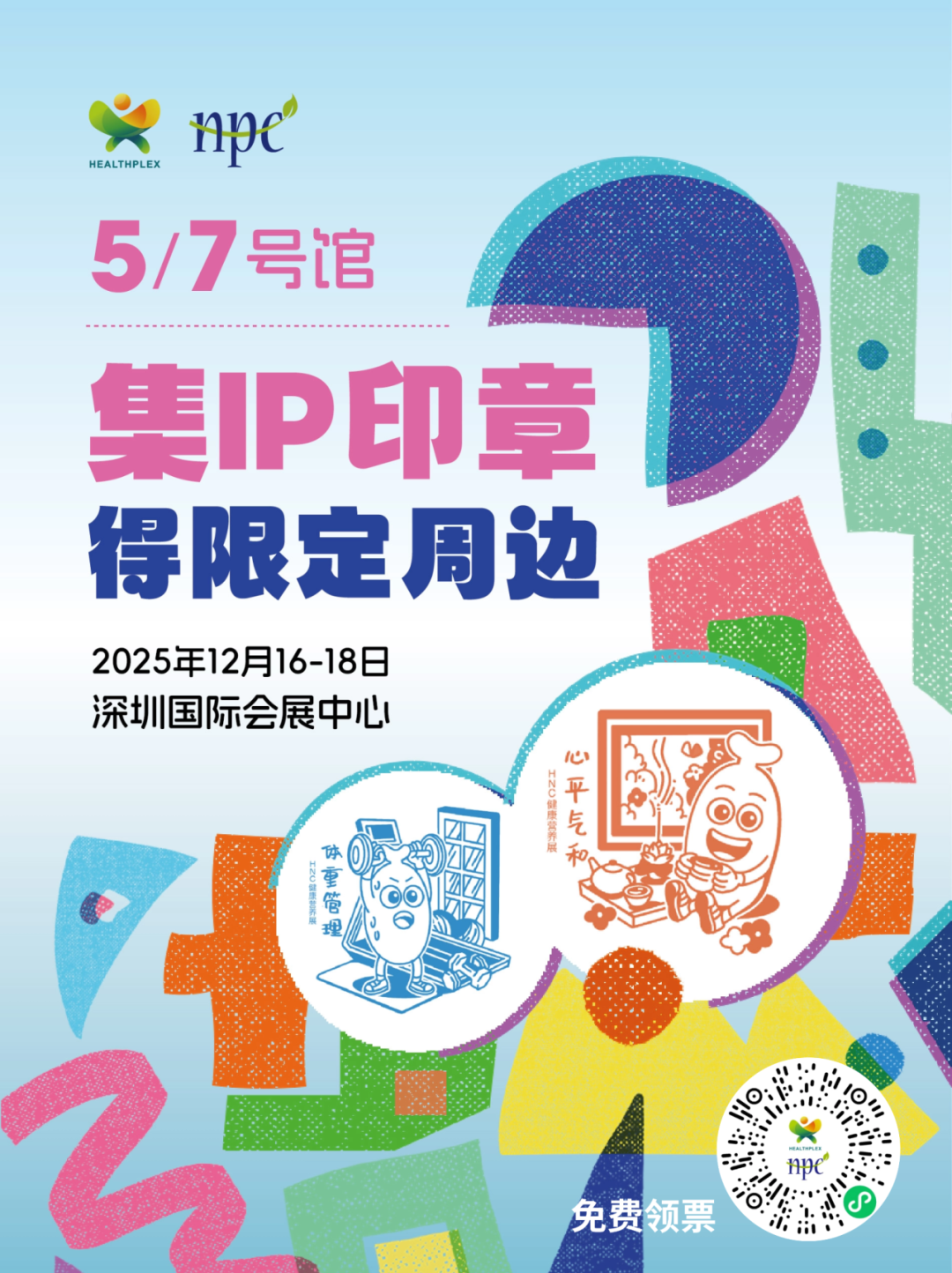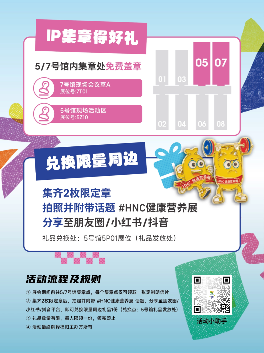 3、集齐2枚限定章后,拍照并附带#HNC健康营养展 话题,分享至朋友圈/小红书/抖音平台,即可兑换限量周边礼品1份(兑换点:5号馆礼品发放处,展位号5P01),礼品数量有限,送完为止,每人限领1份;