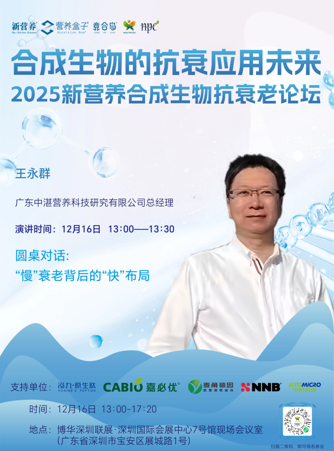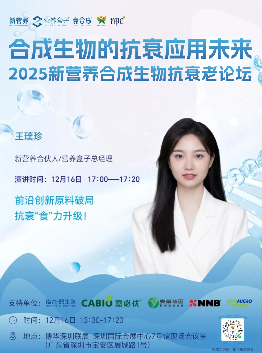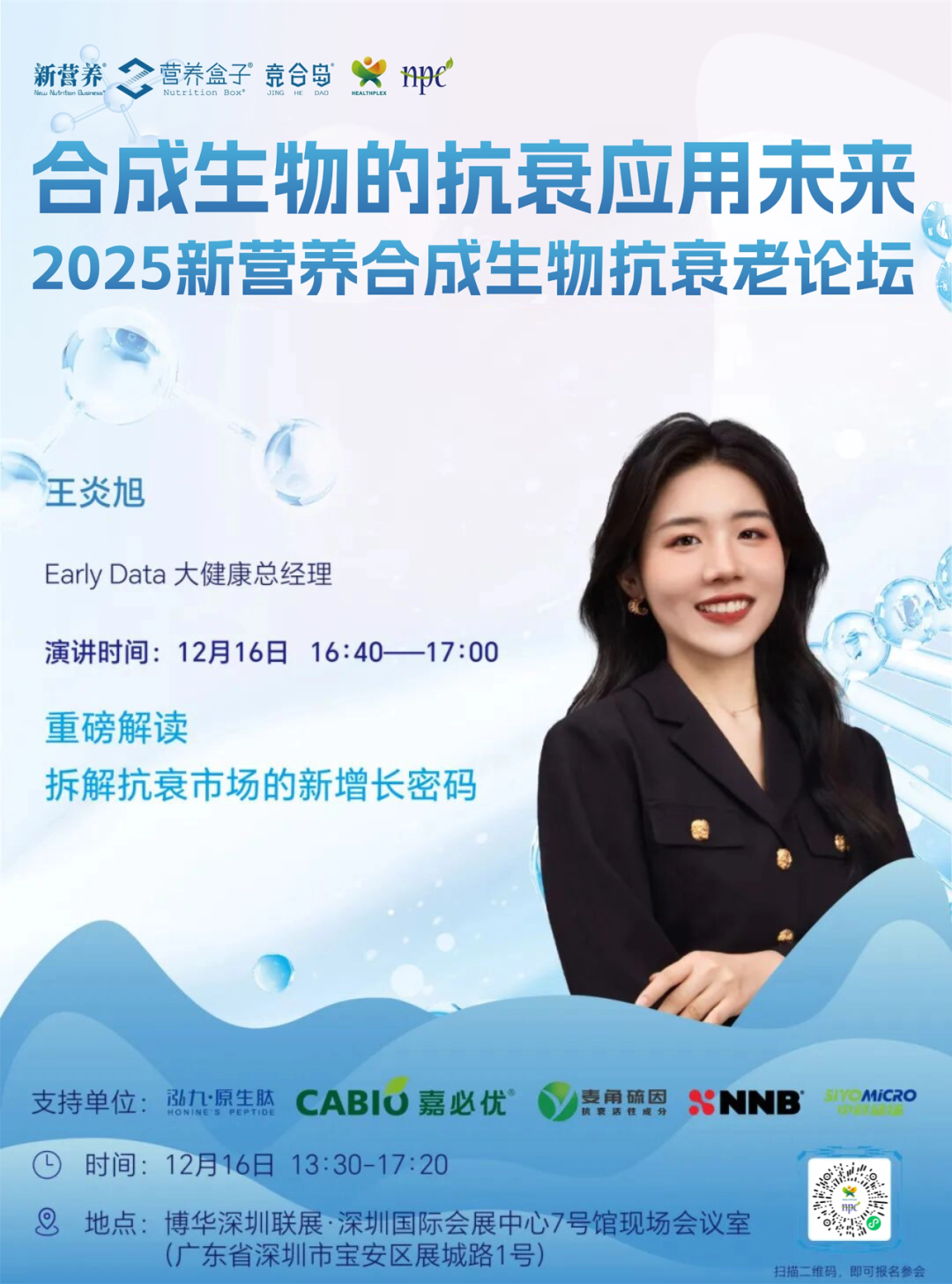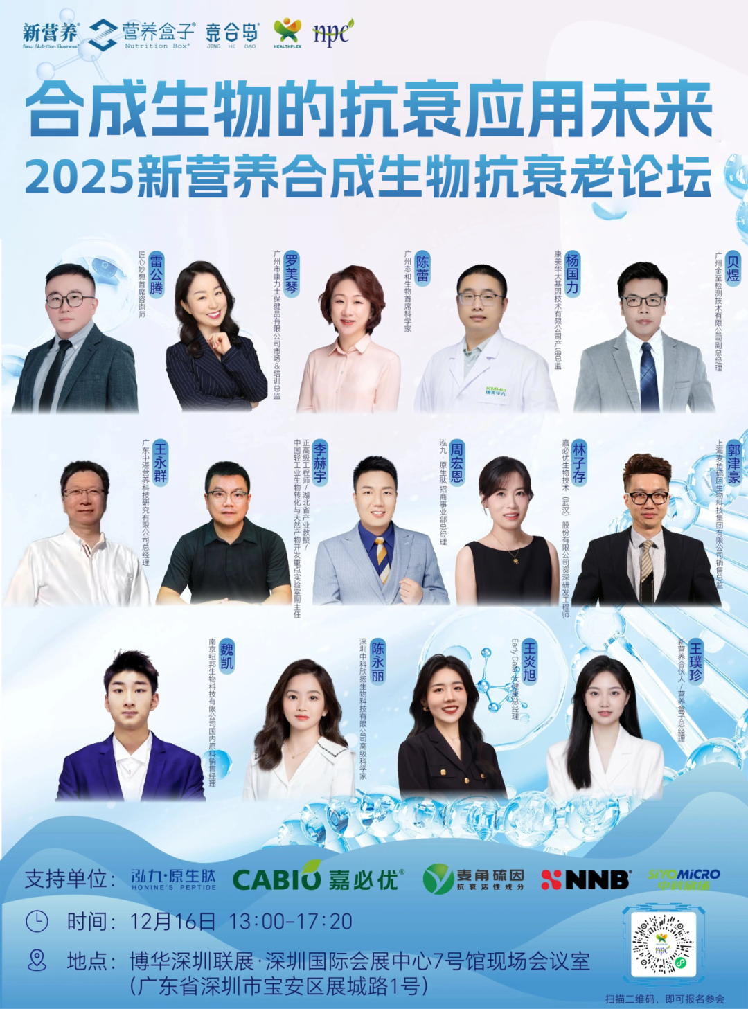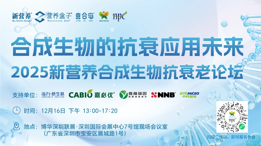 在此背景下,新营养将于12月16日“HNC健康营养展(深圳)”期间,在深圳举办「2025新营养合成生物抗衰老论坛」。论坛以“合成生物的抗衰应用未来”为主题,汇聚行业顶尖专家、企业领袖及科研机构。在论坛上,各方将共同探讨抗衰产品开发的创新路径,分享最新的科研成果和实践经验。这不仅为行业提供了一个交流与合作的平台,更为抗衰行业的未来发展提供了前瞻性洞察与可落地解决方案。