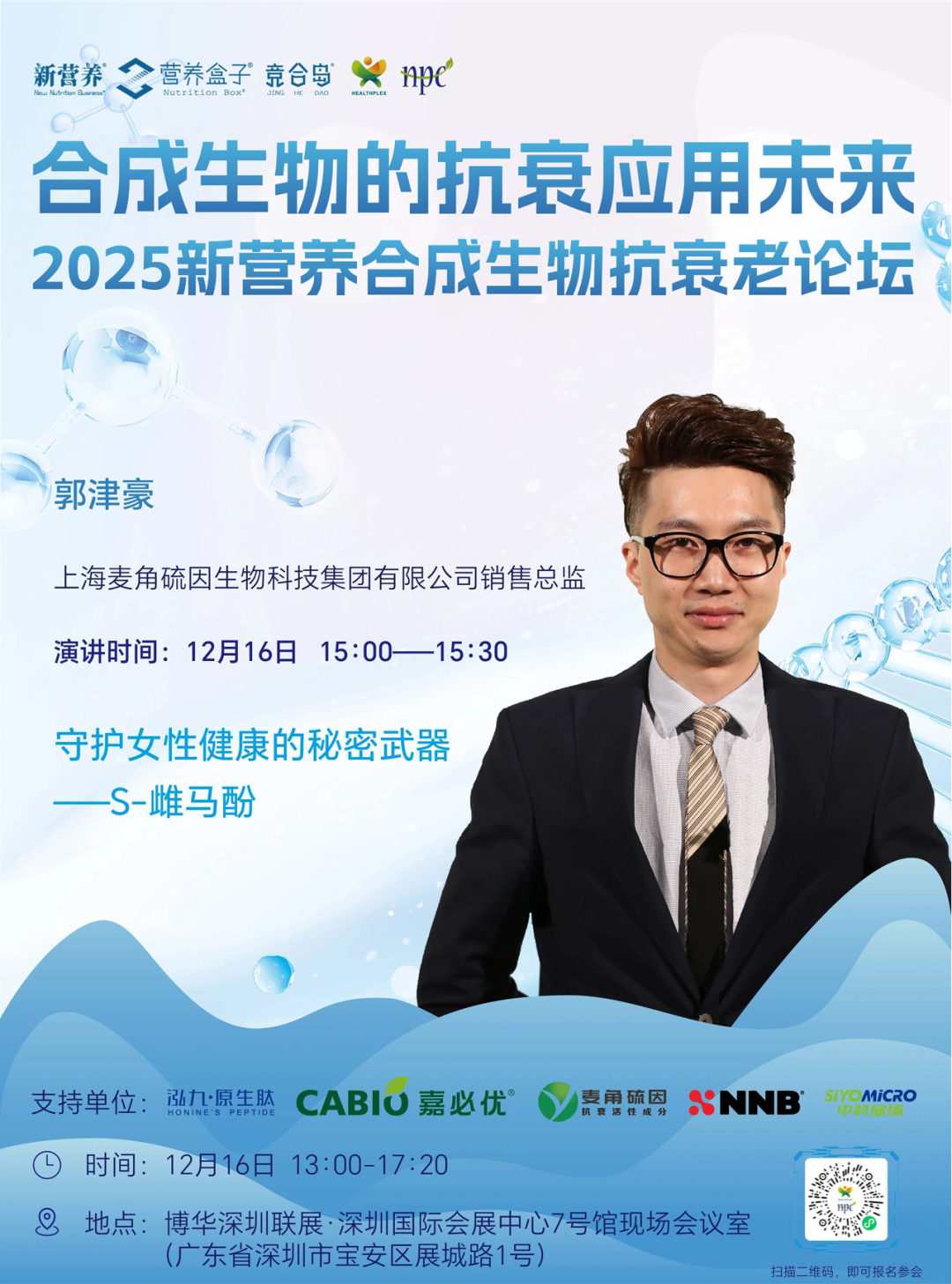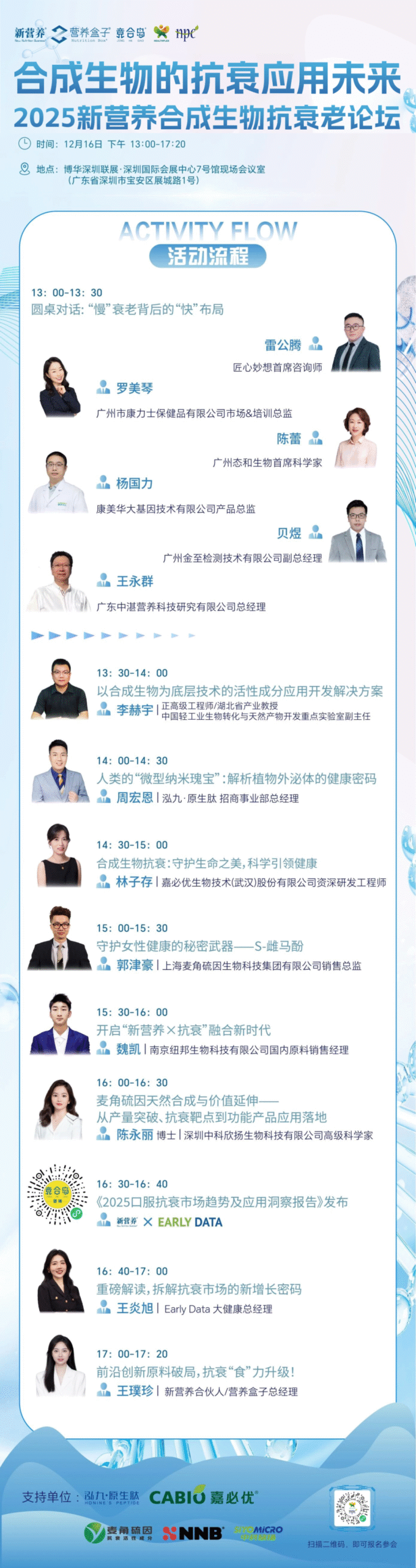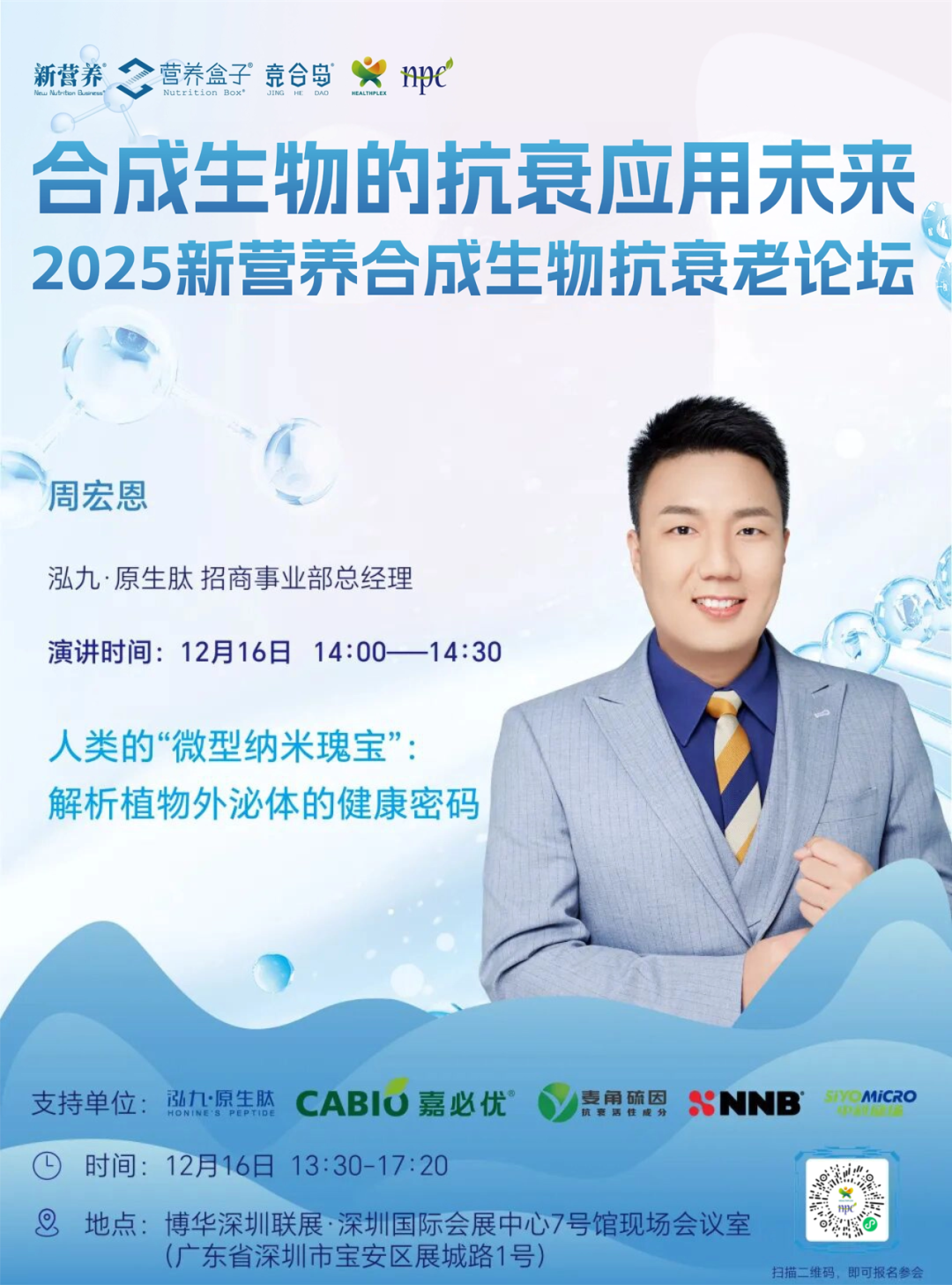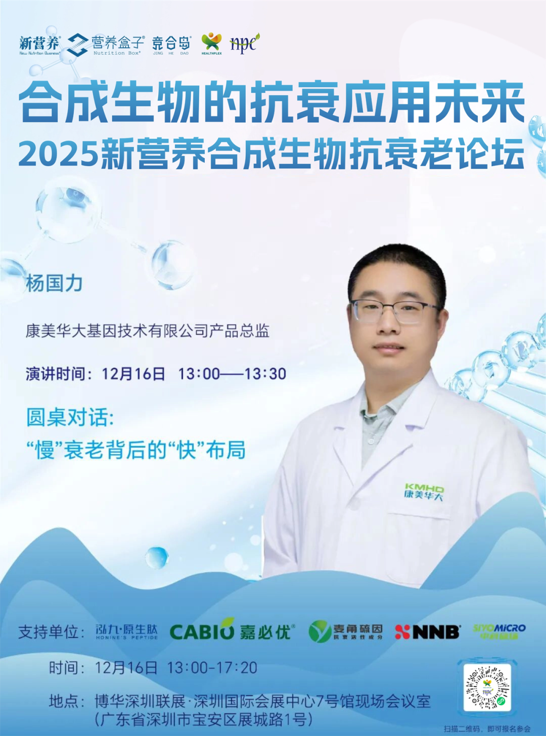 在此背景下,新营养将于12月16日“HNC健康营养展(深圳)”期间,在深圳举办「2025新营养合成生物抗衰老论坛」。论坛以“合成生物的抗衰应用未来”为主题,汇聚行业顶尖专家、企业领袖及科研机构。在论坛上,各方将共同探讨抗衰产品开发的创新路径,分享最新的科研成果和实践经验。这不仅为行业提供了一个交流与合作的平台,更为抗衰行业的未来发展提供了前瞻性洞察与可落地解决方案。