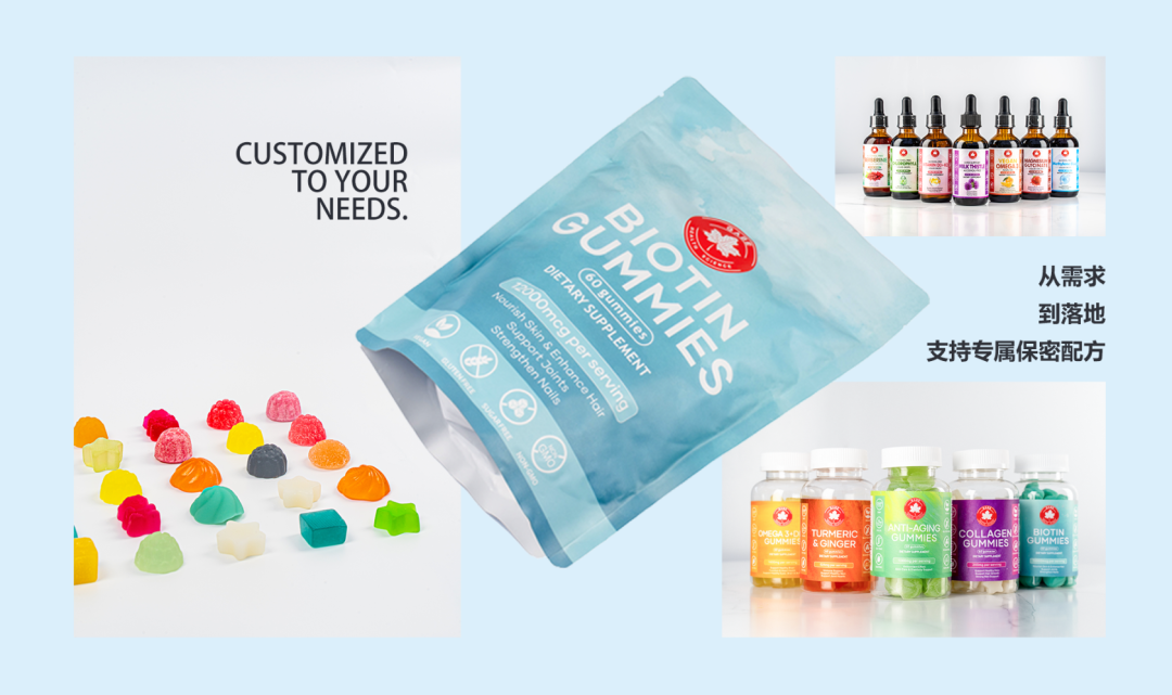 可根据客户具体需求,从多维度开展个性化开发。在功能定位上,支持 “助眠 + 抗衰”“减脂 + 营养补充” 等复合功能定制;成分配比方面,可实现高含量生物素、定制浓度鱼油等精准调配;口感风味上,提供水果味、草本味等多种选择;同时还可进行软糖、片剂、胶囊等产品形态定制及专属包装设计,真正实现 “按需定制,精准匹配”。