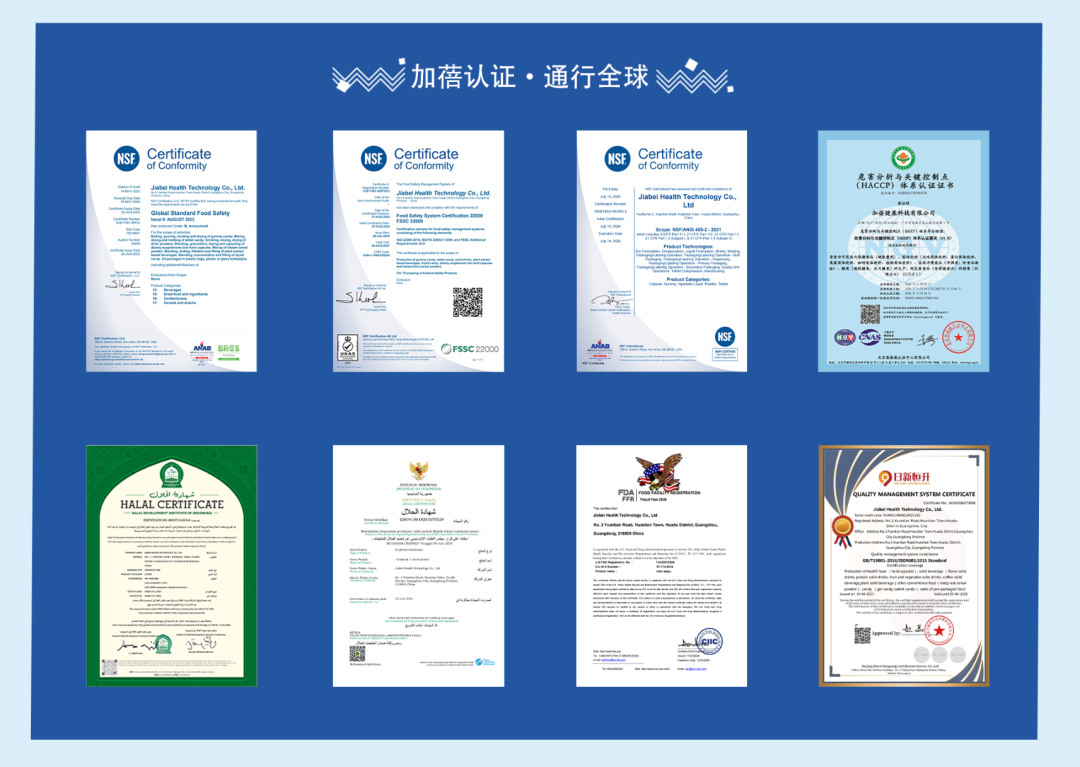 严格遵循 ISO9001、HACCP 国际认证标准,持有《食品生产许可证》《保健食品卫生许可证》及 SC 认证(编号:SC1064401402966 ,所属主体:加蓓健康科技有限公司)。建立全链条品质管控体系,原料入厂时需经过农残、重金属、微生物等多项检测;生产过程实施实时监控与批次追溯管理;成品出库前需完成36项关键指标核验,全方位筑牢品质防线,确保产品符合国内外各项合规要求。