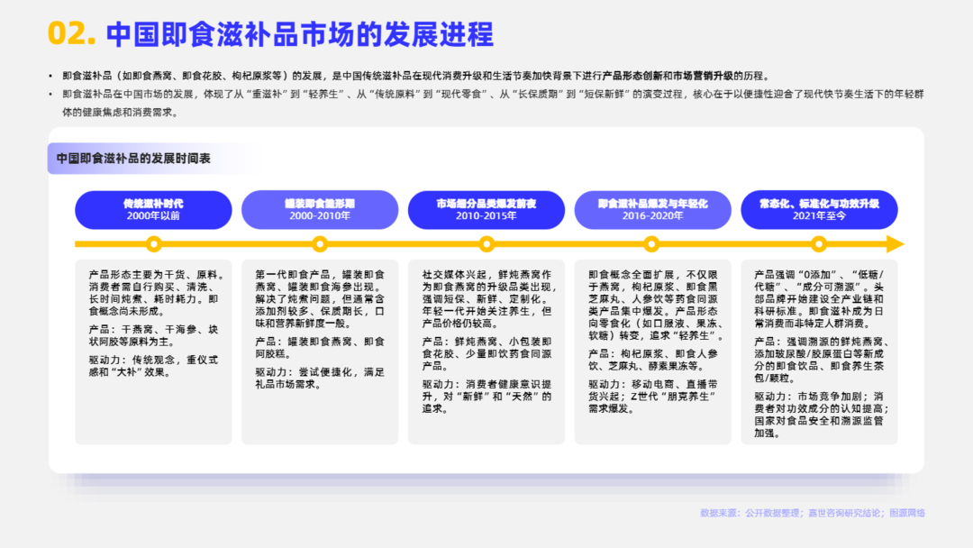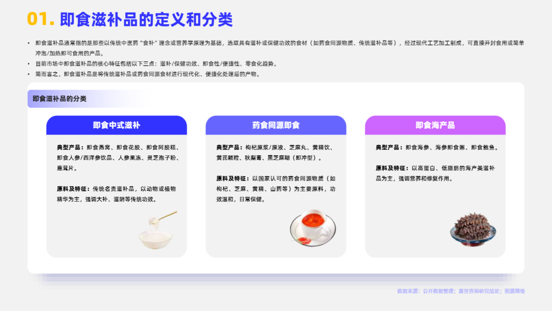 即食滋补品通常指的是那些以传统中医药“食补”理念或营养学原理为基础,选取具有滋补或保健功效的食材(如药食同源物质、传统滋补品等),经过现代工艺加工制成,可直接开封食用或简单冲泡/加热即可食用的产品。目前市场中即食滋补品的核心特征包括以下三点:滋补/保健功效、即食性/便捷性、零食化趋势。本报告将系统性阐述2025即食滋补品行业发展情况。