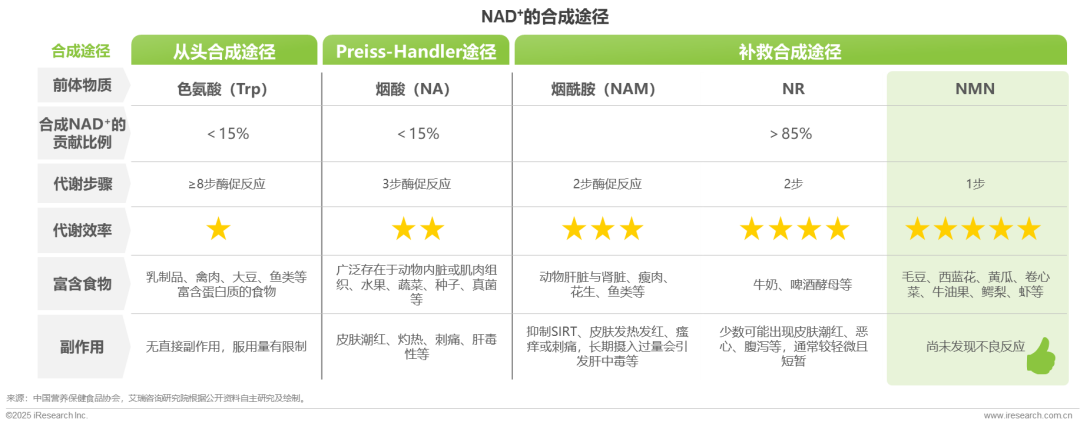 与其他途径相比,补充NMN在NAD+的合成途径中优势显著