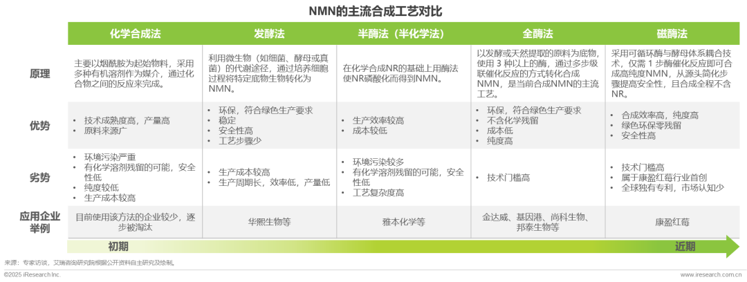 NMN的主流合成工艺有化学合成法、发酵法、半酶法、全酶法和磁酶法。早期NMN主要由化学合成法合成,该方法虽然可以实现量产,但存在纯度低、溶剂残留与环境污染等问题,目前已被逐步淘汰。发酵法通过微生物代谢天然底物提升安全性,但生产周期长、产量低且成本高。半酶法结合化学合成与生物催化,平衡效率与成本,但是仍存在溶剂残留和环境污染的问题。目前全酶法是主流的合成工艺,通过多步级联反应实现NMN合成,纯度高、无化学残留且绿色环保,基因港、金达威等头部企业均采用全酶法生产NMN。磁酶法是对全酶法的革新优化,属于康盈红莓的行业首创,已获全球独家专利,合成纯度高,品质好,零残留,绿色更环保,且合成全过程不含NR,但因技术门槛高,仍处于市场认知的早期阶段。