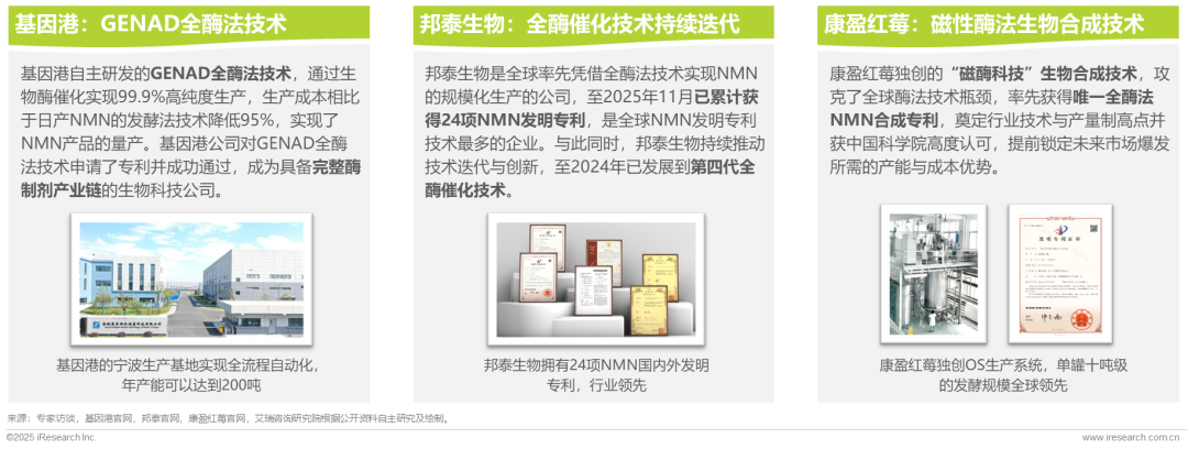全酶法凭借高纯度、成本可控、绿色安全等优势,推动NMN行业实现升级突破。基因港、邦泰生物、康盈红莓、日本三井等企业更是致力于全酶法的革新优化,并申请了相关的专利技术,构筑自身的竞争壁垒。其中,基因港专研GENAD全酶法技术,推动生产成本大幅下降并实现了NMN产品量产;邦泰生物多年以来持续推动全酶催化技术的迭代与创新,累计获得20+项NMN发明专利;康盈红莓独创“磁酶科技”生物合成技术,攻克了全球酶法技术瓶颈,率先获得唯一全酶法NMN合成专利,奠定行业技术与产量制高点,并获中国科学院高度认可。