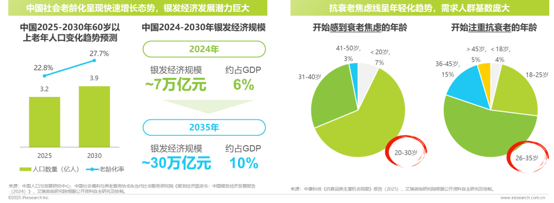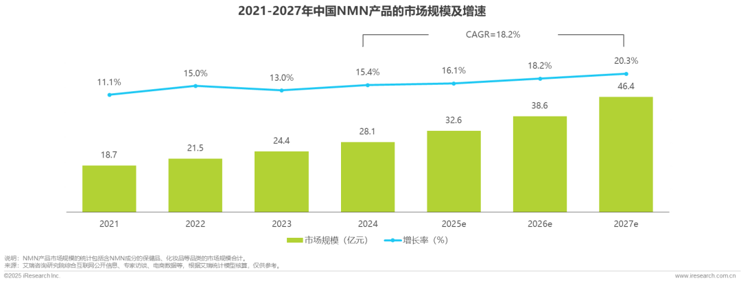 中国社会老龄化进程显著提速。根据中国人口与发展研究中心预测,在2025-2030年期间,60岁及以上老年人口规模将从3.2亿人增长至3.9亿人,老龄化率将从22.8%增至27.7%。规模庞大的“60后”老年人群驱动“银发经济”蓬勃发展,为抗衰老市场提供了潜力巨大的基本盘。同时,“抗衰老焦虑线”正大幅前置。以“90后”为主的年轻群体更早觉醒“抗衰老”意识。60后引领的“银发经济”和90后驱动的“抗初老”形成双重动力,共同推动抗衰老产品市场需求释放,为NMN行业发展提供广阔的成长空间。