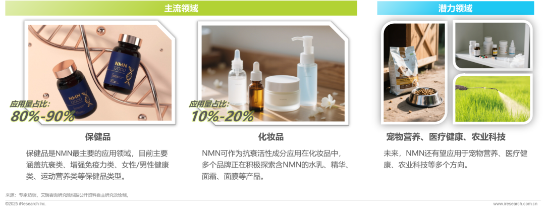 NMN主流应用领域包括保健品和化妆品,未来有望进一步渗透到宠物营养、医疗健康和农业科技等潜力场景