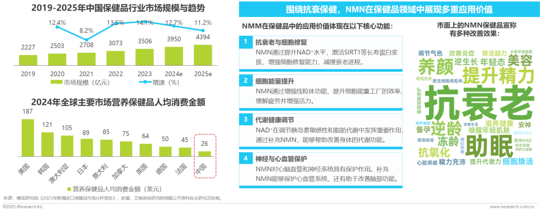 中国保健品市场蕴藏巨大提升空间,NMN凭借抗衰等多重应用价值,持续拓展应用边界,未来发展潜力显著