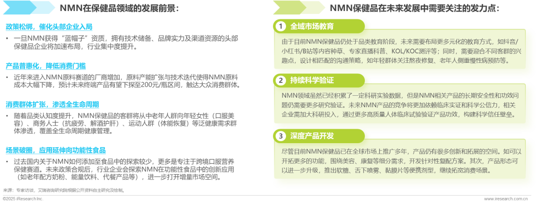 随着国内政策逐步放开,NMN保健品市场迎来进一步升级。政策合规化将加速头部企业入局,依托技术与渠道优势整合行业资源,推动市场格局重塑;价格普惠化趋势下,NMN产品将触达更广范围的消费群体,客群圈层由银发人群向年轻女性、商务人士、运动人群等延伸;在产品的应用场景层面,未来企业将会进一步探索NMN在功能性食品中的创新应用。未来竞争核心聚焦三大方向:构建全渠道市场教育体系、持续投入安全性和功效性的临床循证研究,深化产品功能延伸与形态创新。