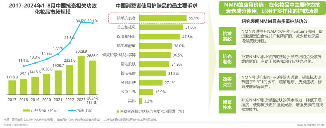 在抗衰理念持续渗透消费市场的背景下,除了保健品,消费者在选择护肤品时也会首要考虑抗皱抗衰老等功效。青眼情报数据显示,中国抗衰相关功效化妆品市场规模2023年突破3000亿元,2024年1月-8月已达2686.9亿元,同比增长30.1%,千亿赛道仍处于高速扩张期。NMN作为抗衰活性成分,应用在化妆品中可发挥抗皱紧致、抗光老化、改善炎症、修复补水等多重功效价值,适配多样化的护肤场景。