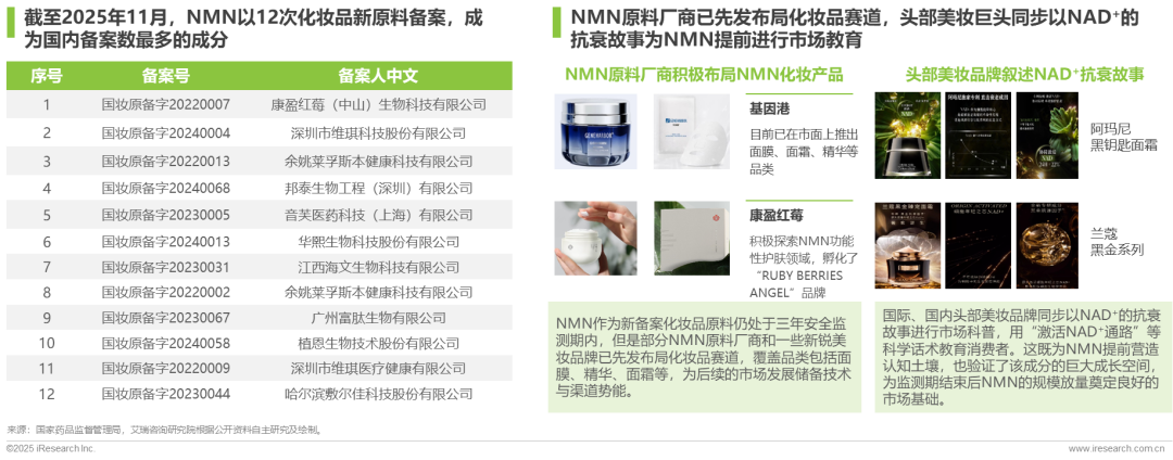 NMN成为国内备案量最大的化妆品新原料;原料厂商率先布局护肤赛道,头部美妆品牌以NAD+预热市场