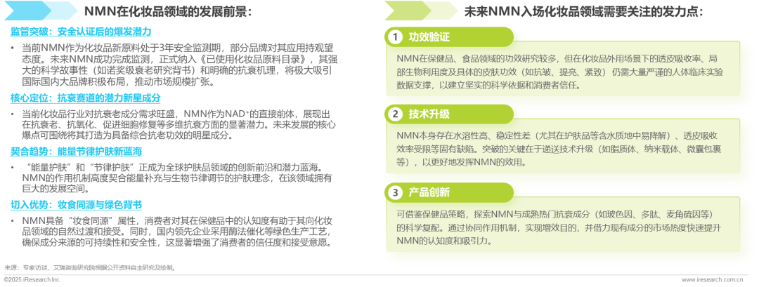 NMN作为NAD+的关键前体,凭借其在细胞能量代谢和衰老调控中的核心作用,正吸引全球化妆品行业的广泛关注。其发展前景广阔:一方面,NMN已通过化妆品原料备案,合规化程度高,待突破安全监测期后,凭借诺奖背书的科学公信力,市场潜力将加速释放;另一方面,借势“能量护肤”“节律护肤”等新兴蓝海赛道,有望实现多维抗衰价值的跃升。同时,要实现NMN在化妆品领域的平稳落地,需要关注功效的临床实证、递送技术升级以及产品策略的创新需求。